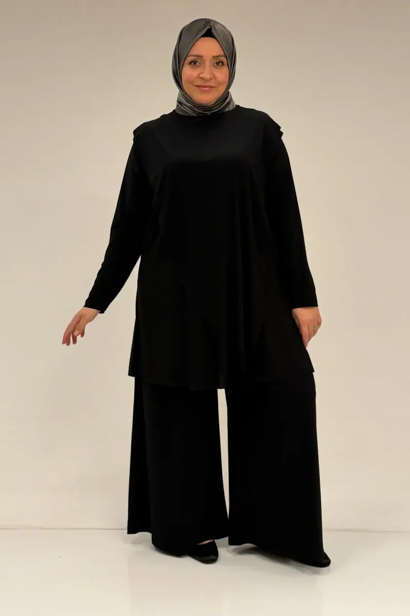 67004 Büyük Beden Önü Ve Arkası Pelerin Detaylı Sandy Pantolonlu Takım - Siyah