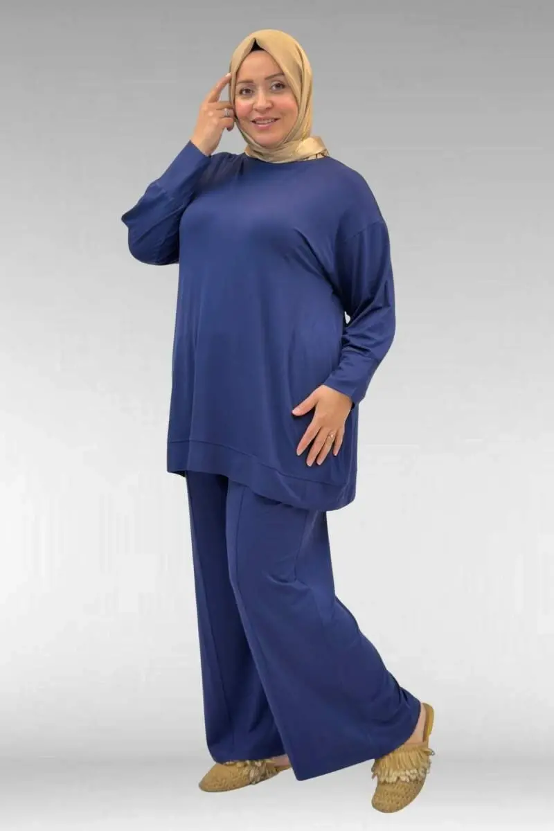 67007 Büyük Beden Kol Ve Etek Ucu Kendinden Ribanalı Pantolonlu Takım - İndigo