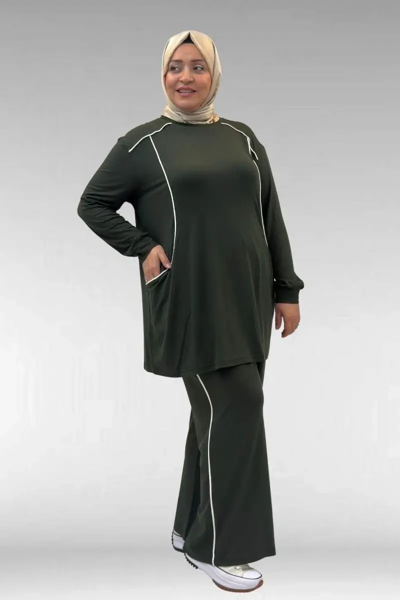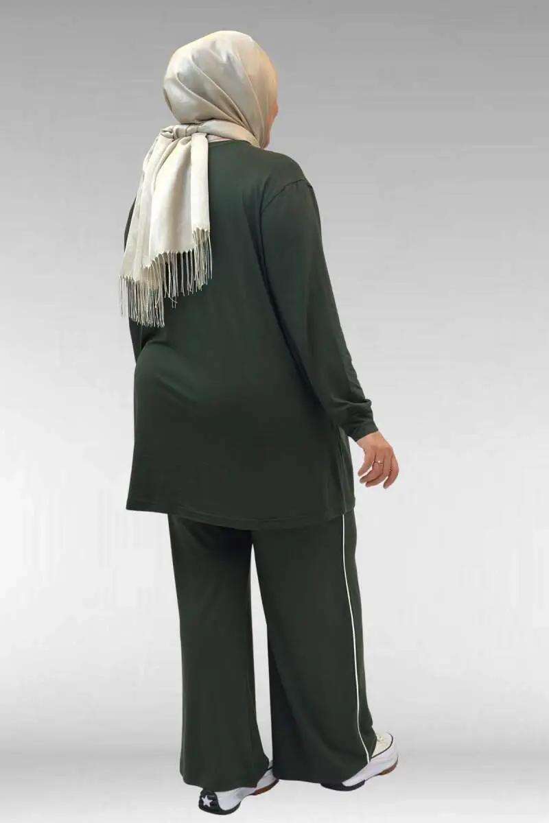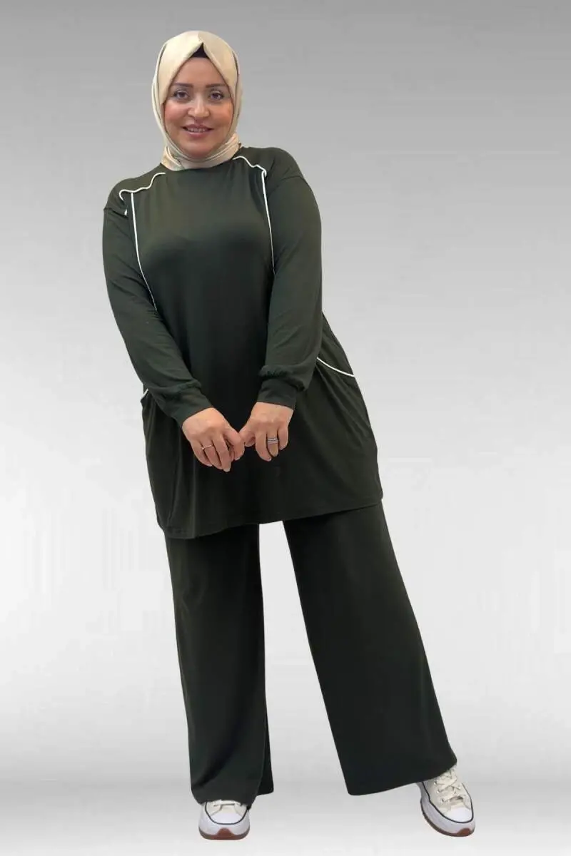 67012 Büyük Beden Biye Detaylı Penye Pantolonlu Takım - Haki