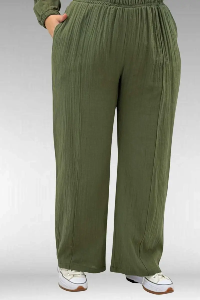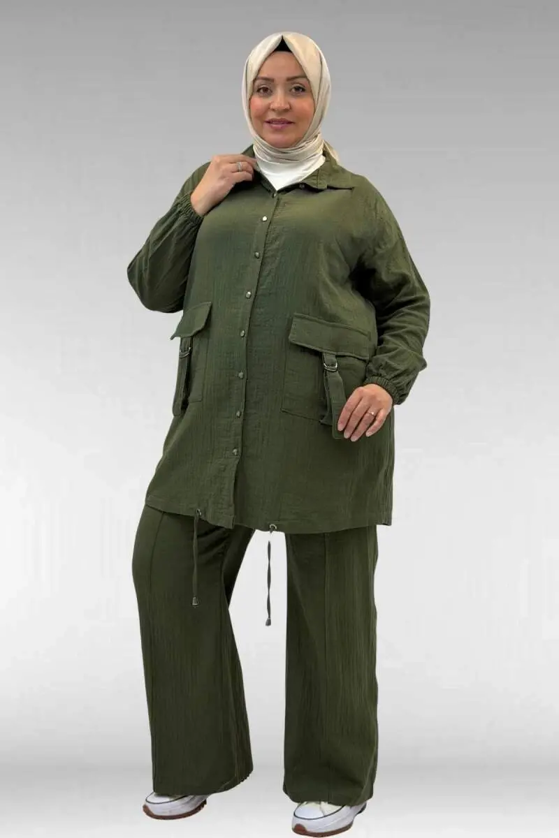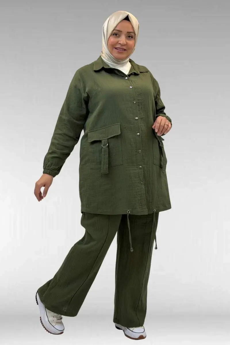 67015 Büyük Beden Cepleri D Toka Detaylı Müslin Pantolonlu Takım - Haki