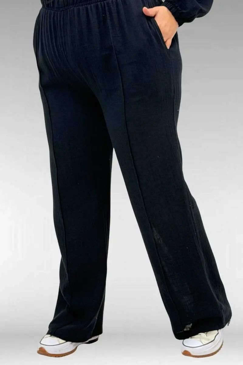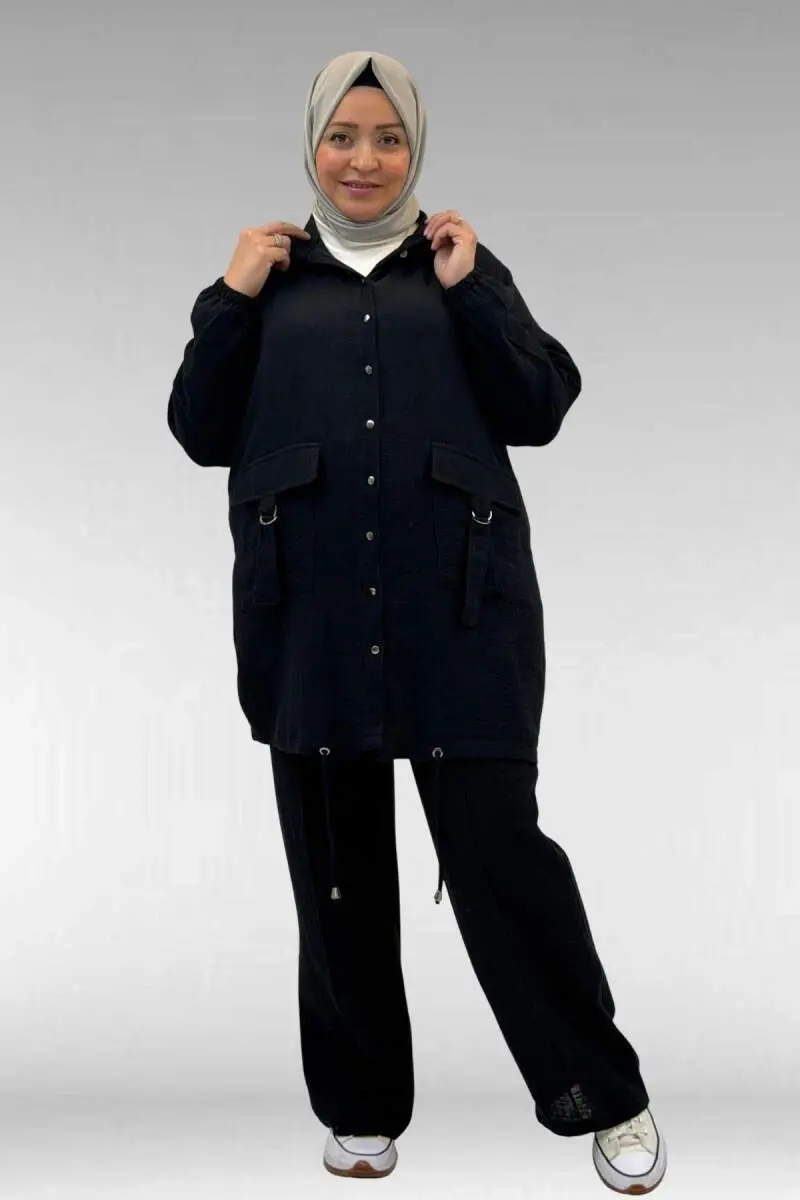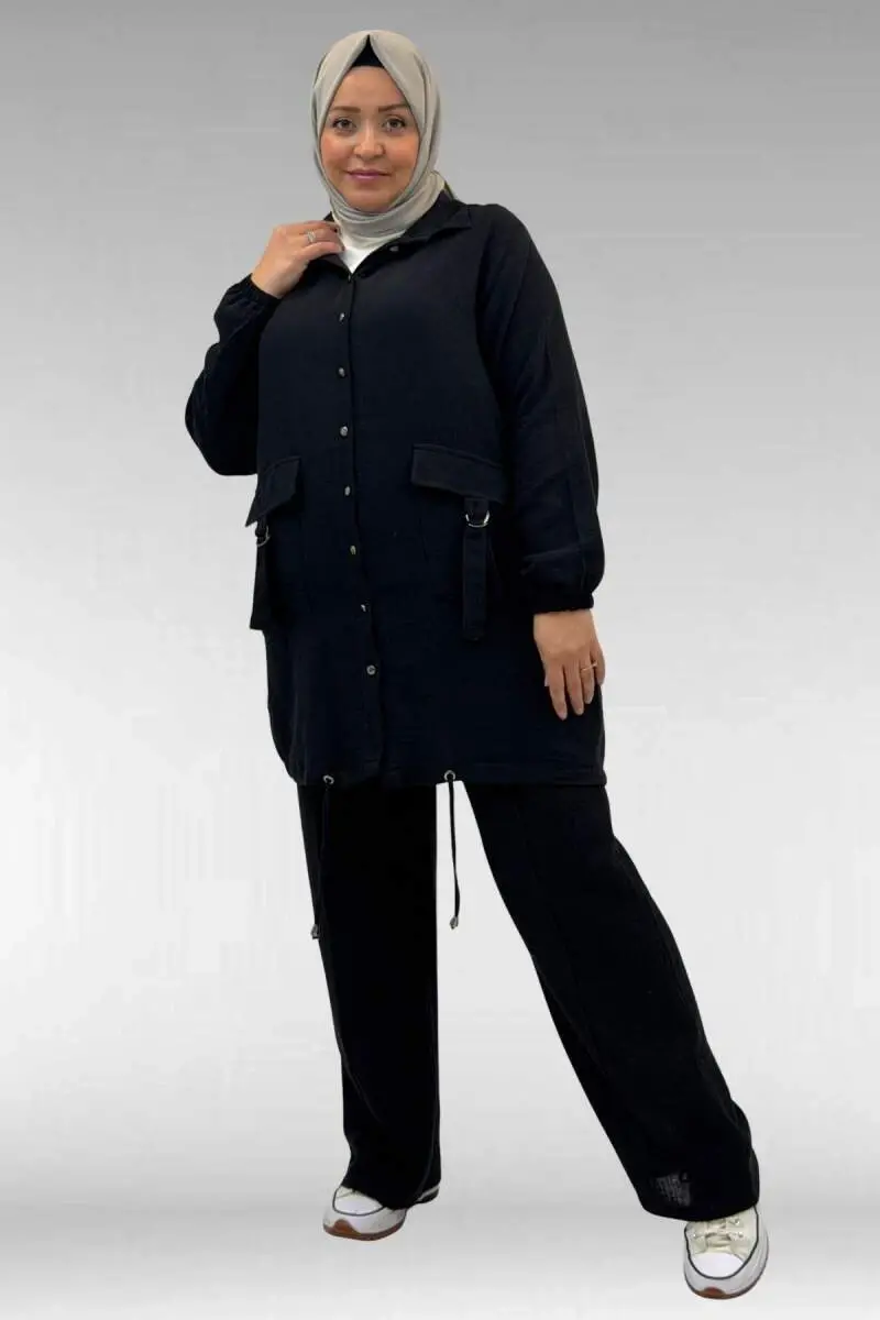 67015 Büyük Beden Cepleri D Toka Detaylı Müslin Pantolonlu Takım - Siyah