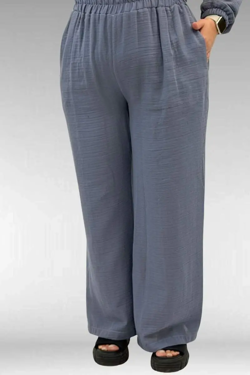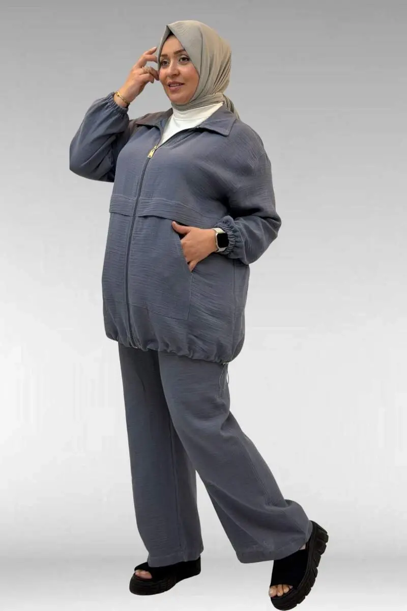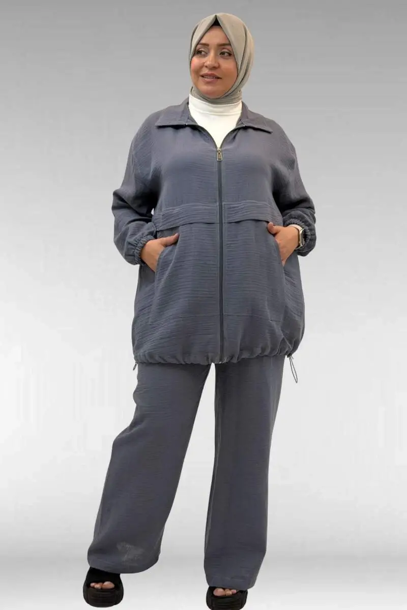 67016 Büyük Beden Kol Ve Etek Ucu Lastik Detaylı Müslin Pantolonlu Takım - Antrasit