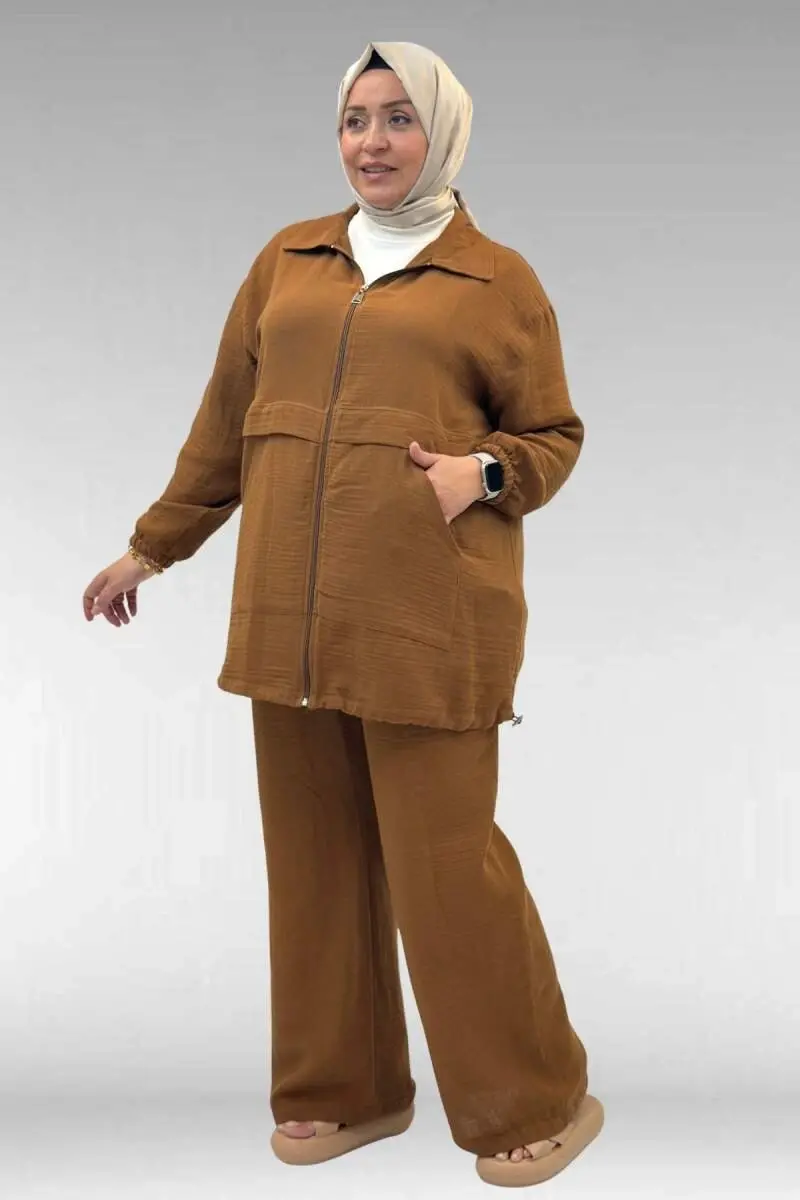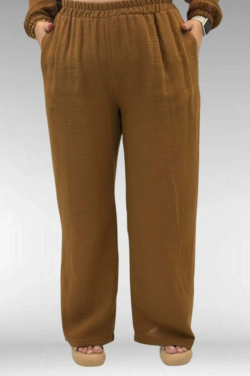 67016 Büyük Beden Kol Ve Etek Ucu Lastik Detaylı Müslin Pantolonlu Takım - Kahve