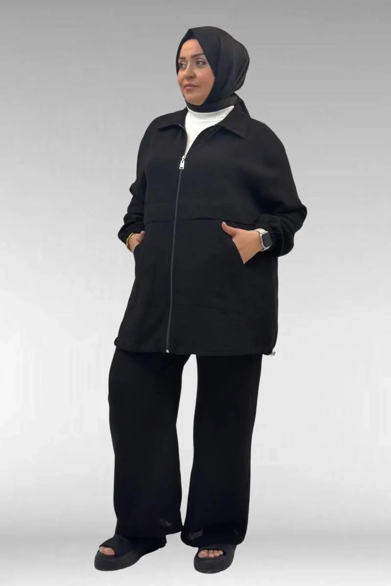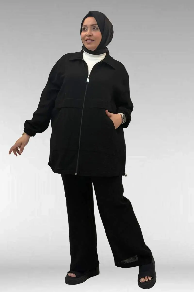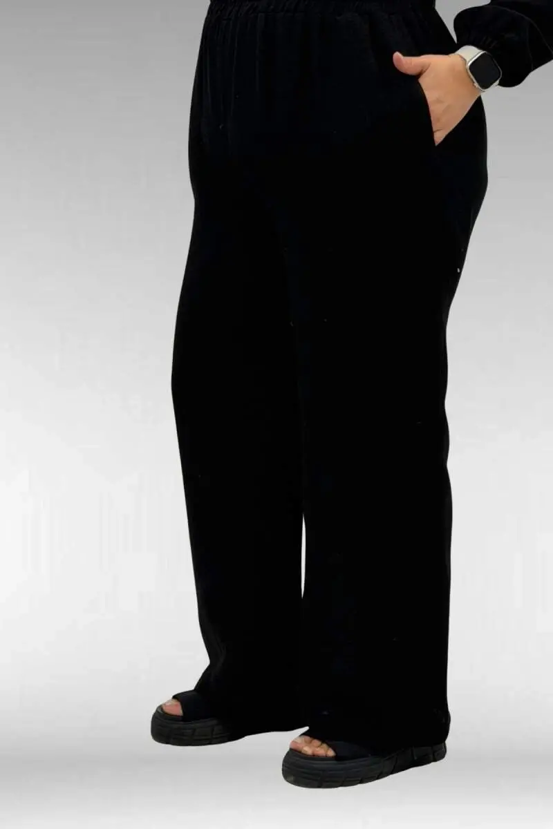 67016 Büyük Beden Kol Ve Etek Ucu Lastik Detaylı Müslin Pantolonlu Takım - Siyah