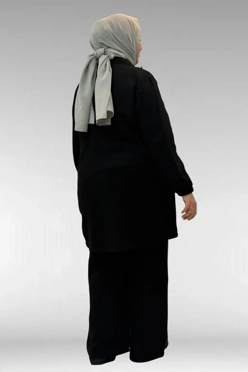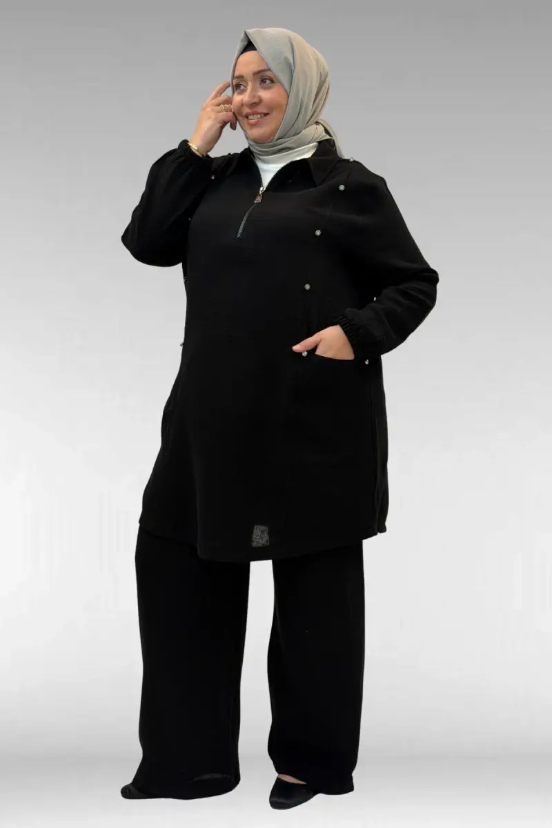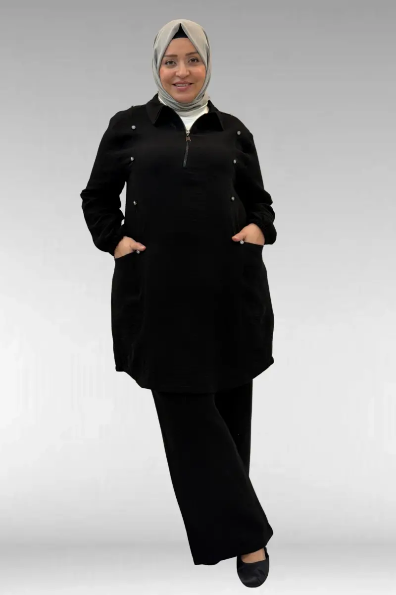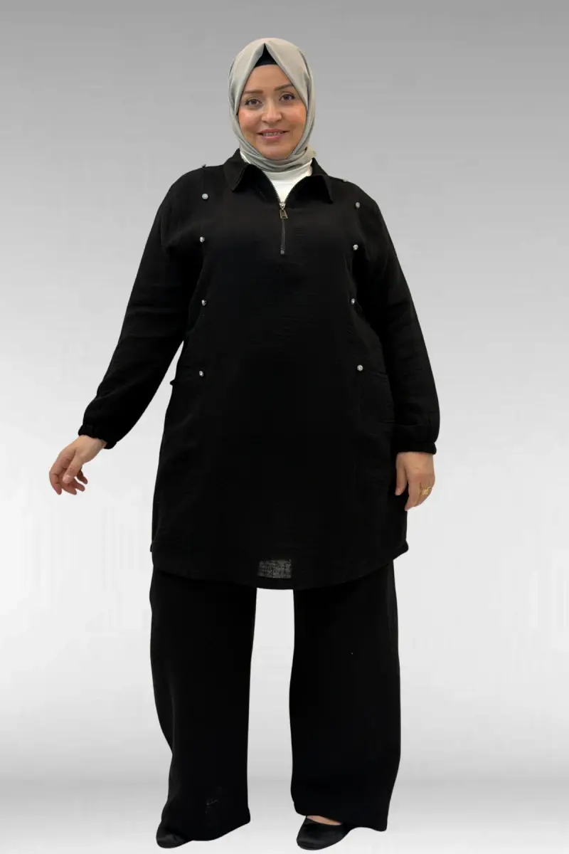 67020 Büyük Beden Yarım Fermuarlı Erkek Yakalı Müslin Pantolonlu Takım - Siyah