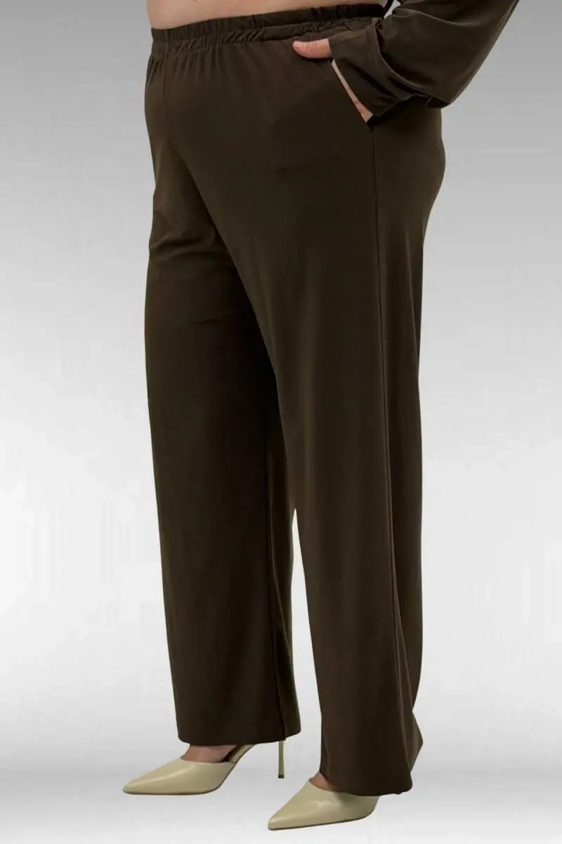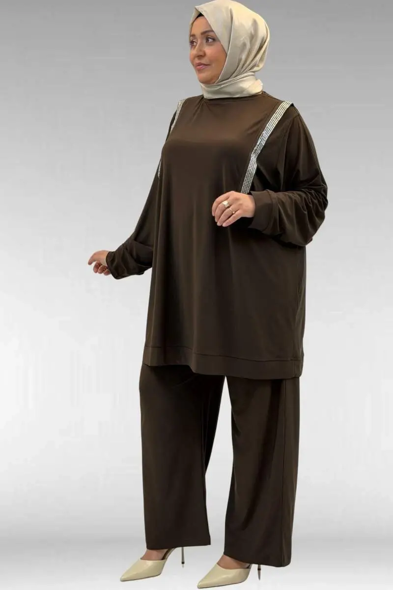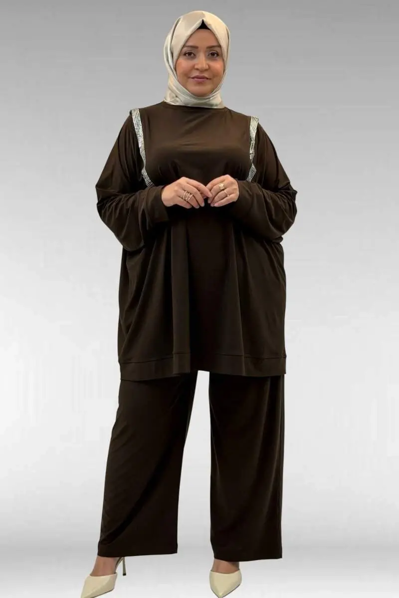 67022 Büyük Beden Omzu Taş Detaylı Sandy Pantolonlu Takım - Kahve