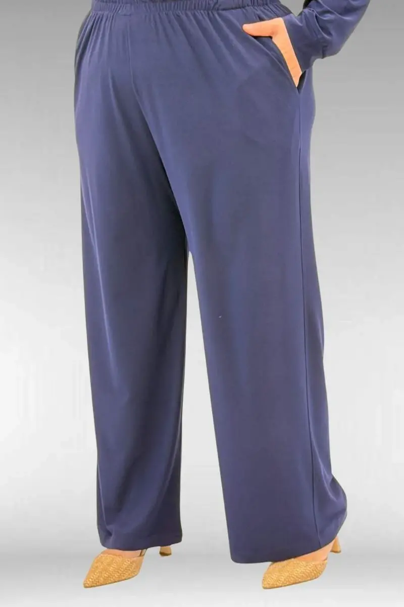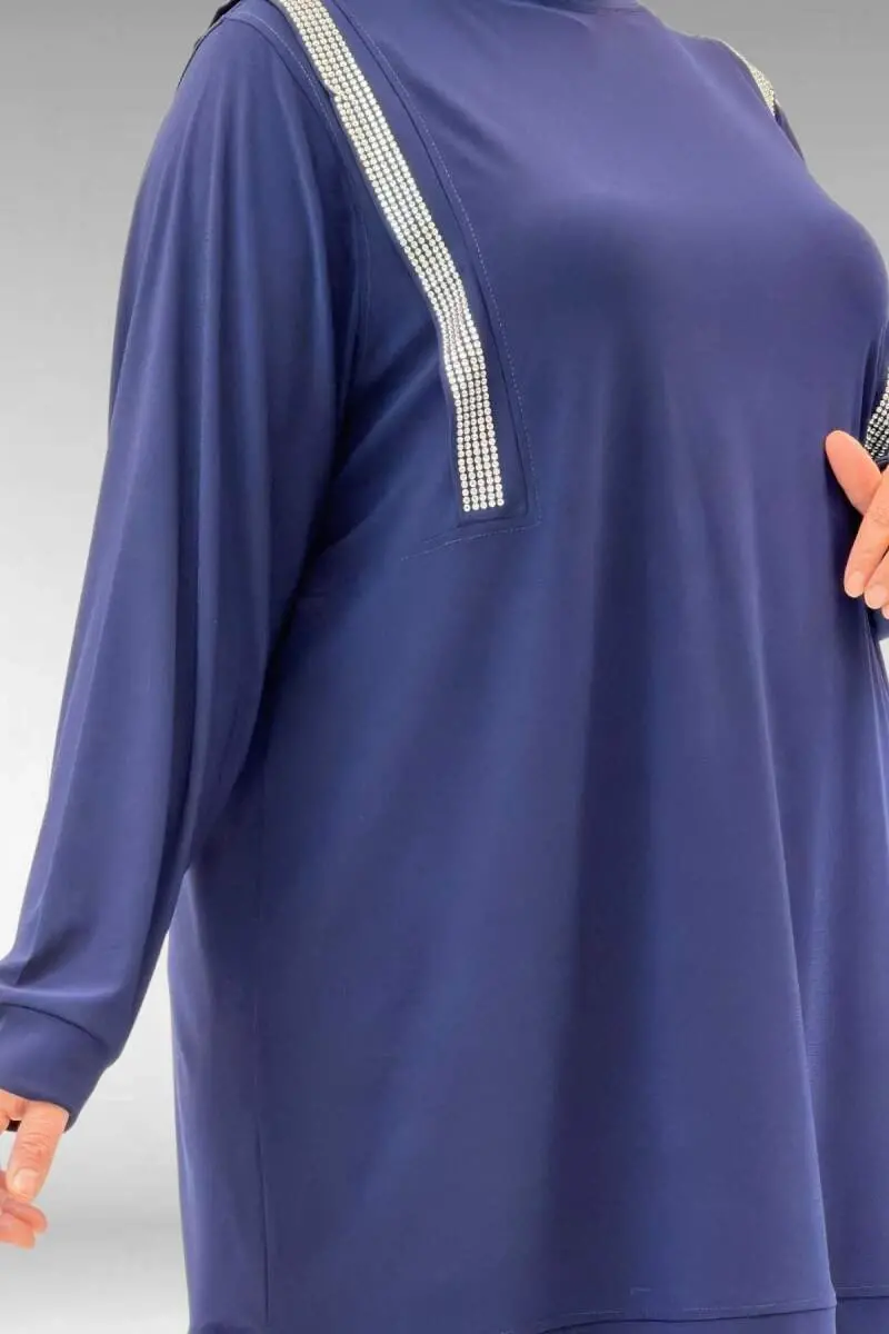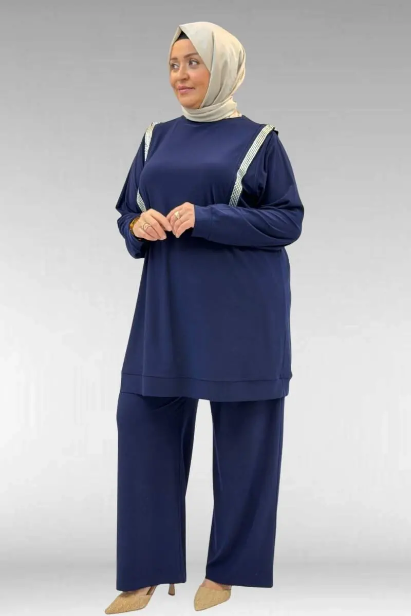 67022 Büyük Beden Omzu Taş Detaylı Sandy Pantolonlu Takım - Lacivert