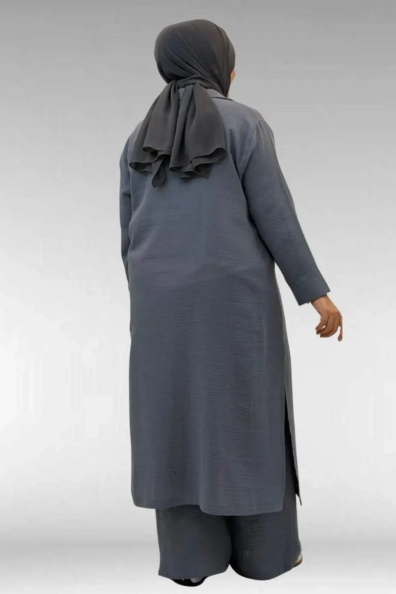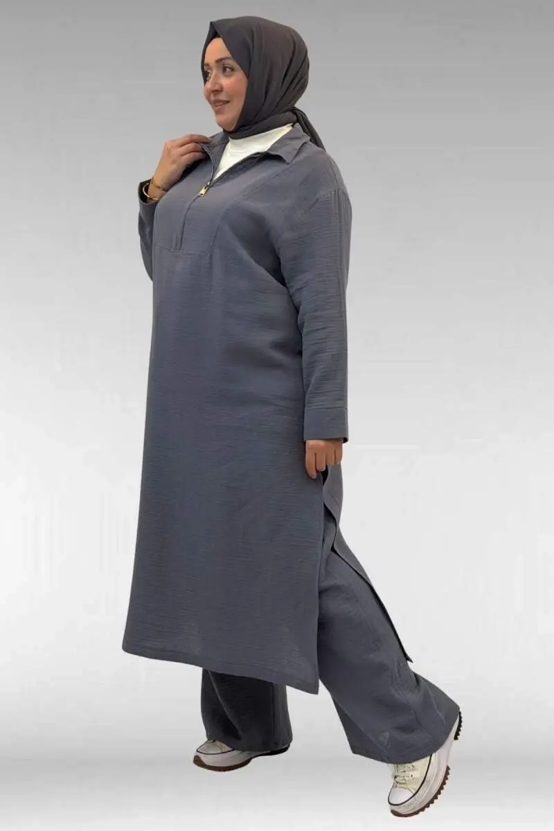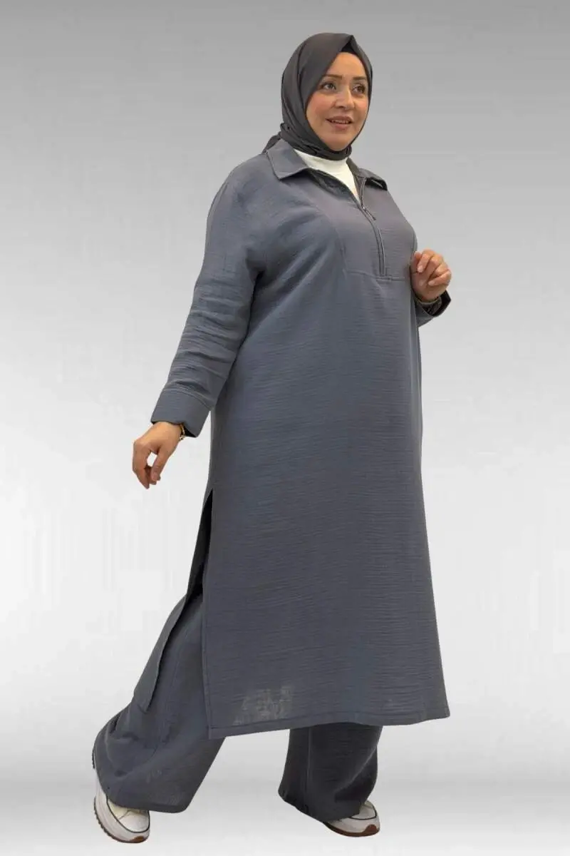 67026 Büyük Beden Erkek Yaka Yarım Fermuarlı Müslin Pantolonlu Takım - Antrasit