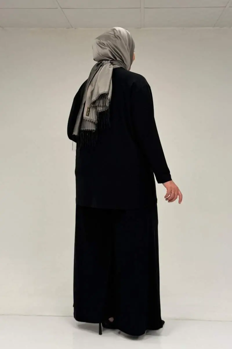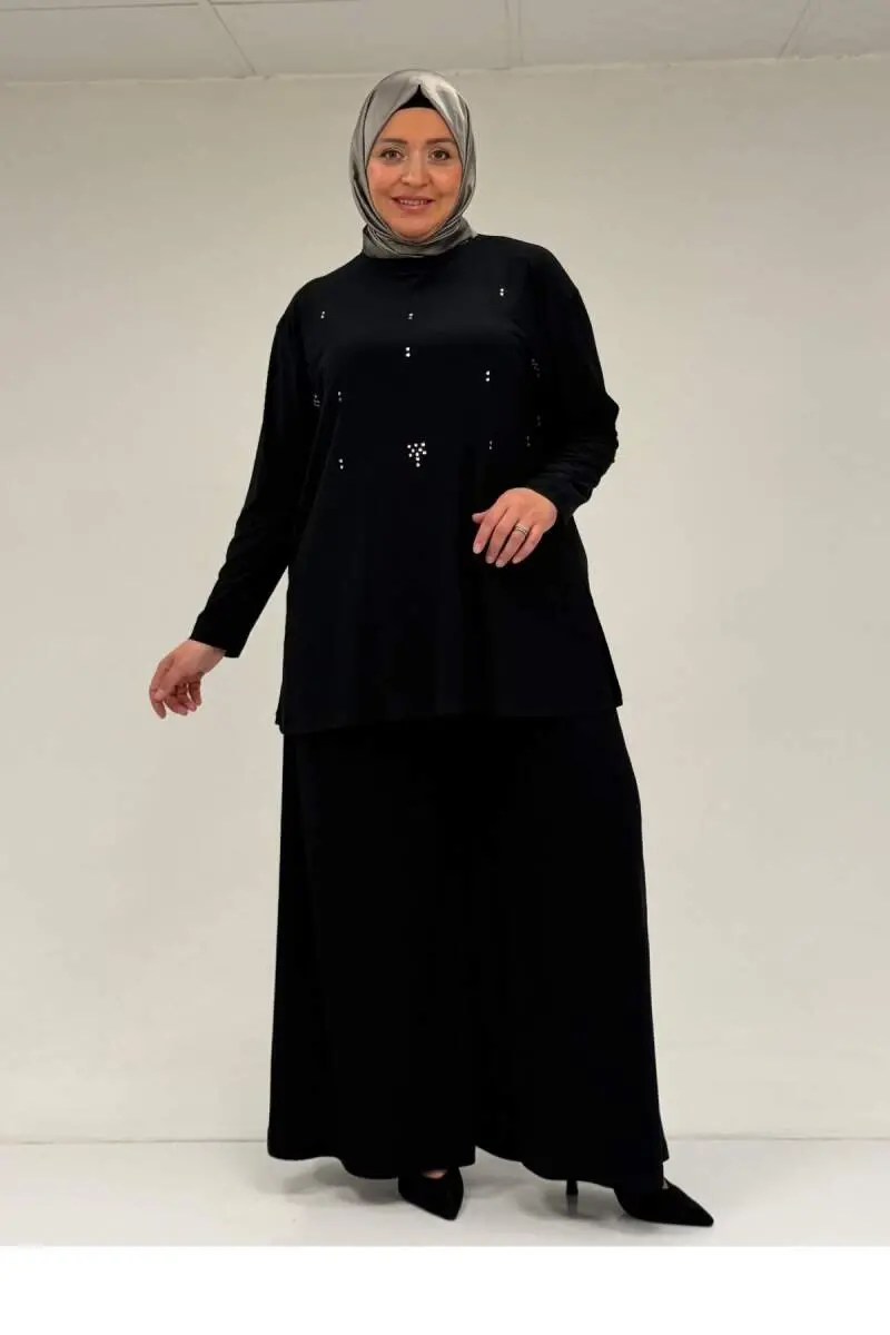 67030 Büyük Beden Yanı Yırtmaçlı Sandy Pantolonlu Takım - Siyah