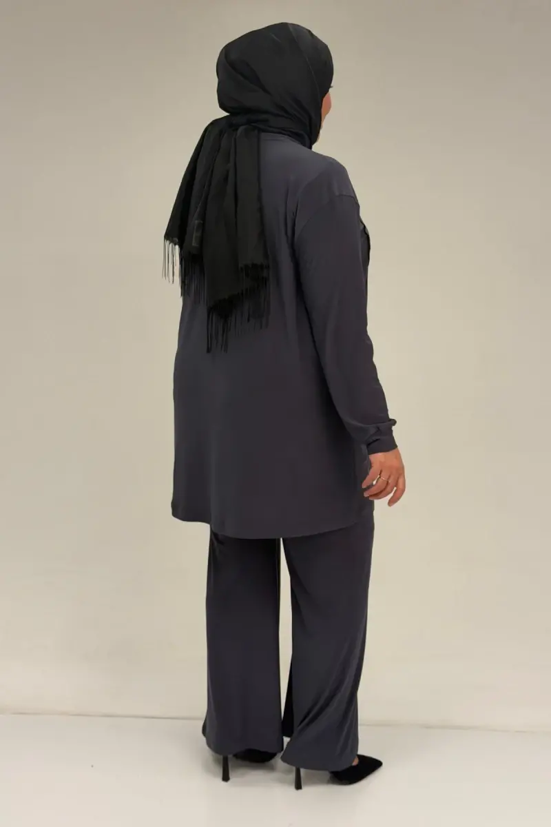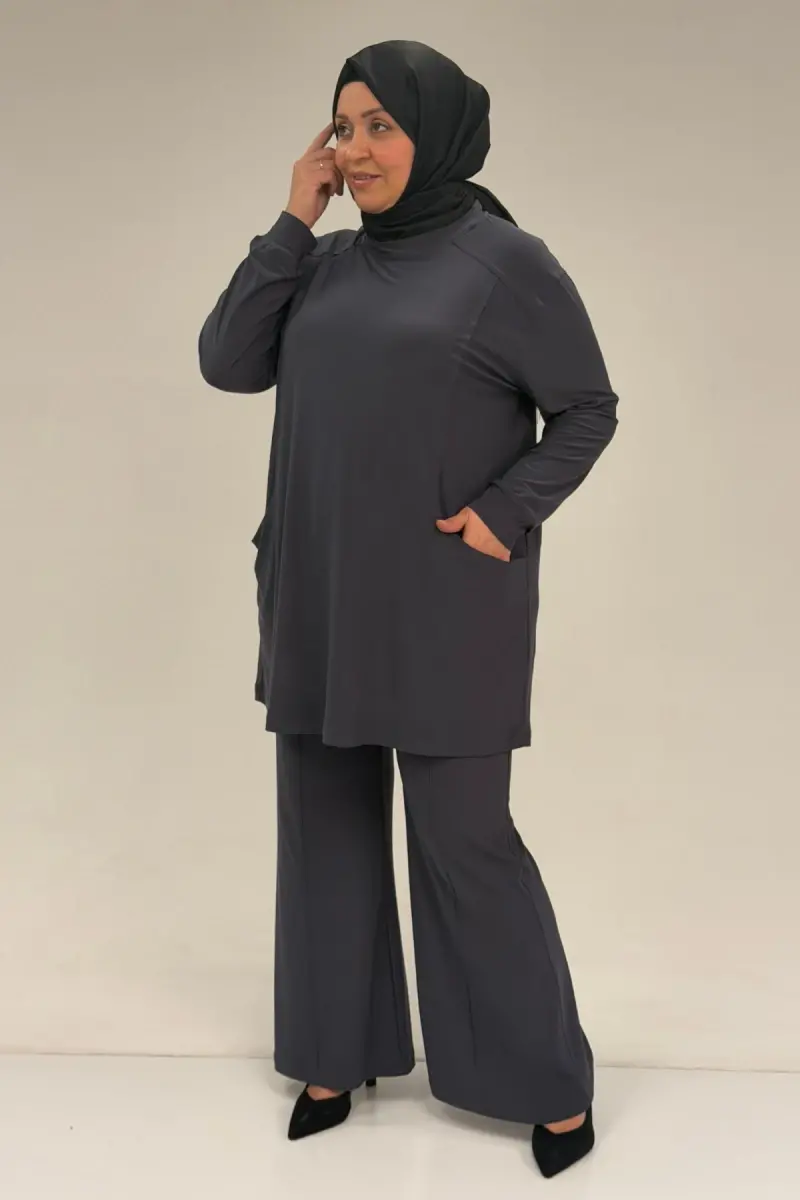 67031 Büyük Beden Yanları Cep Detaylı Pantolonlu Sandy Takım - Antrasit