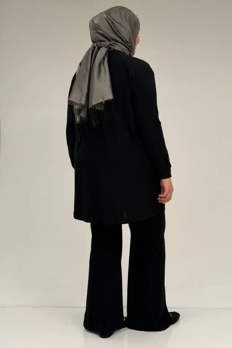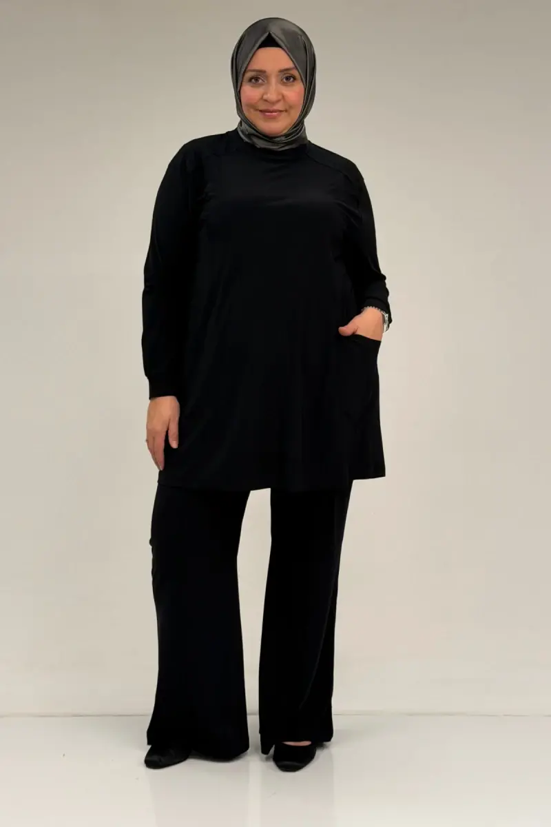 67031 Büyük Beden Yanları Cep Detaylı Pantolonlu Sandy Takım - Siyah