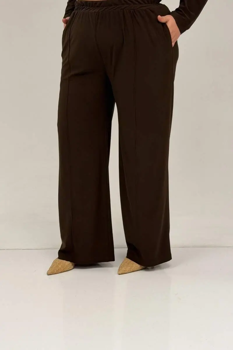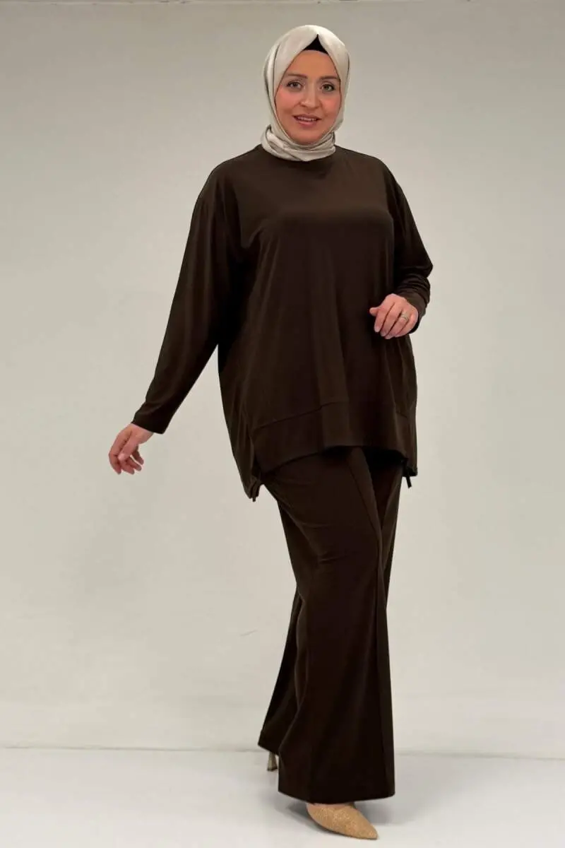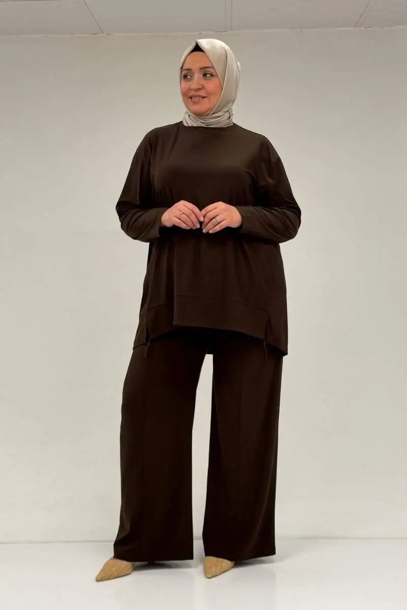 67033 Büyük Beden Etek Ucu Parçalı Sandy Pantolonlu Takım - Kahve