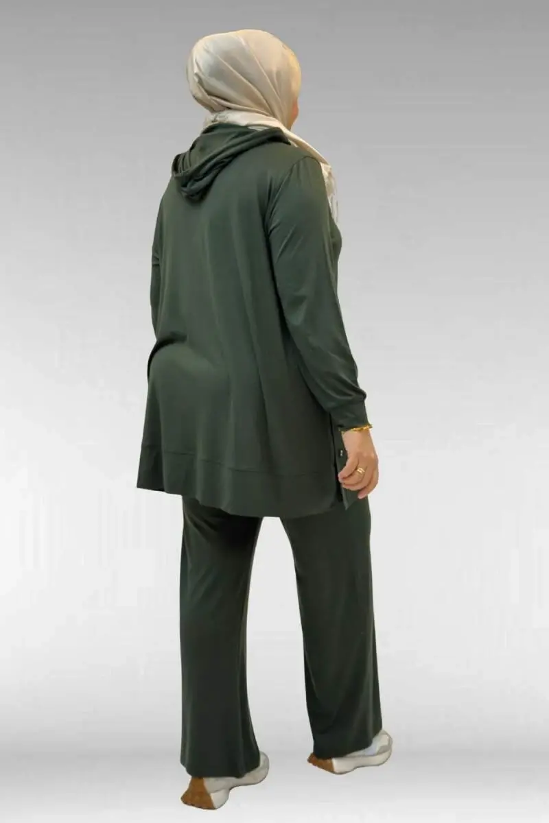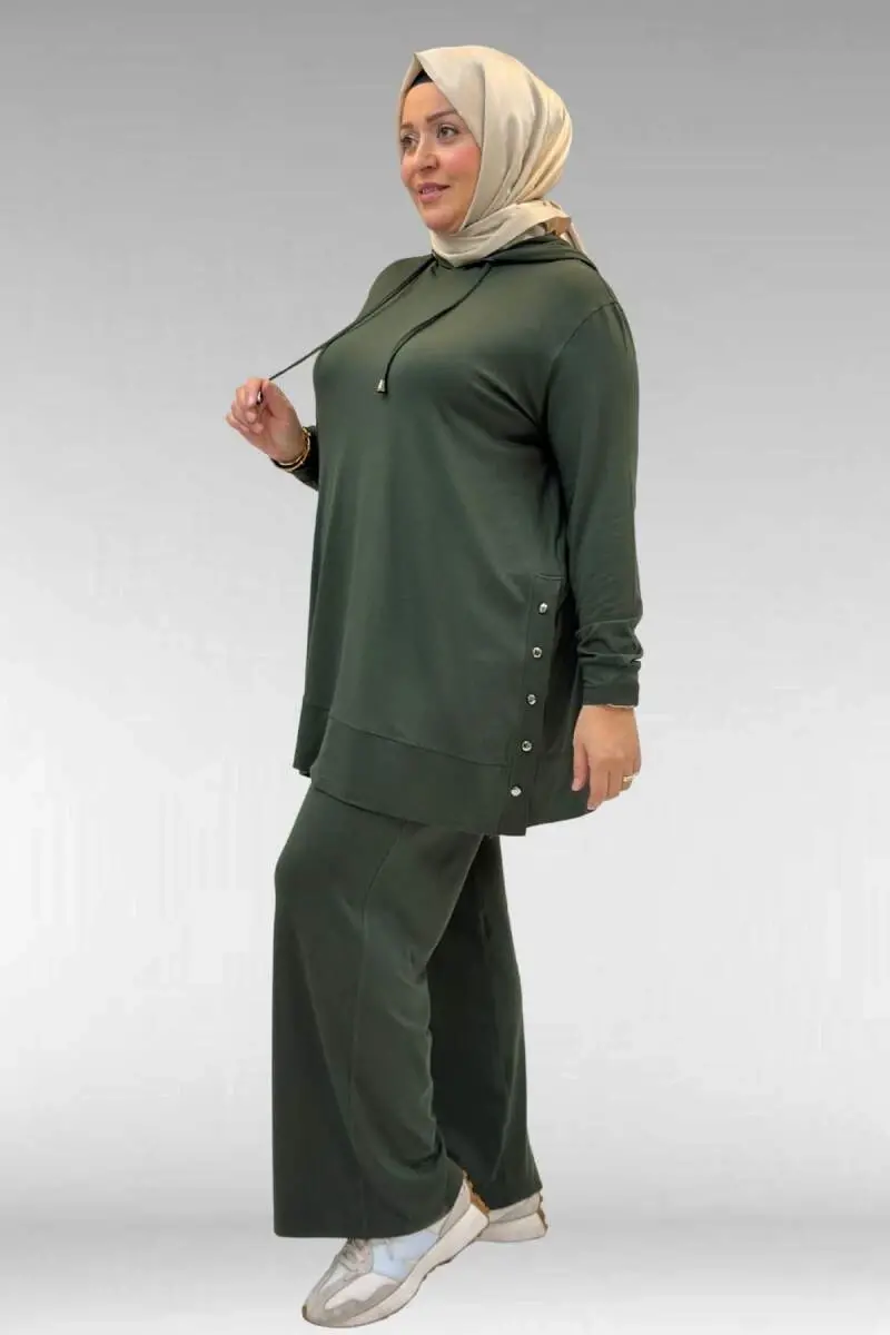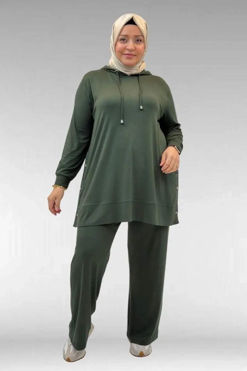 67034 Büyük Beden Yanları Patlı Penye Pantolonlu Takım - Haki