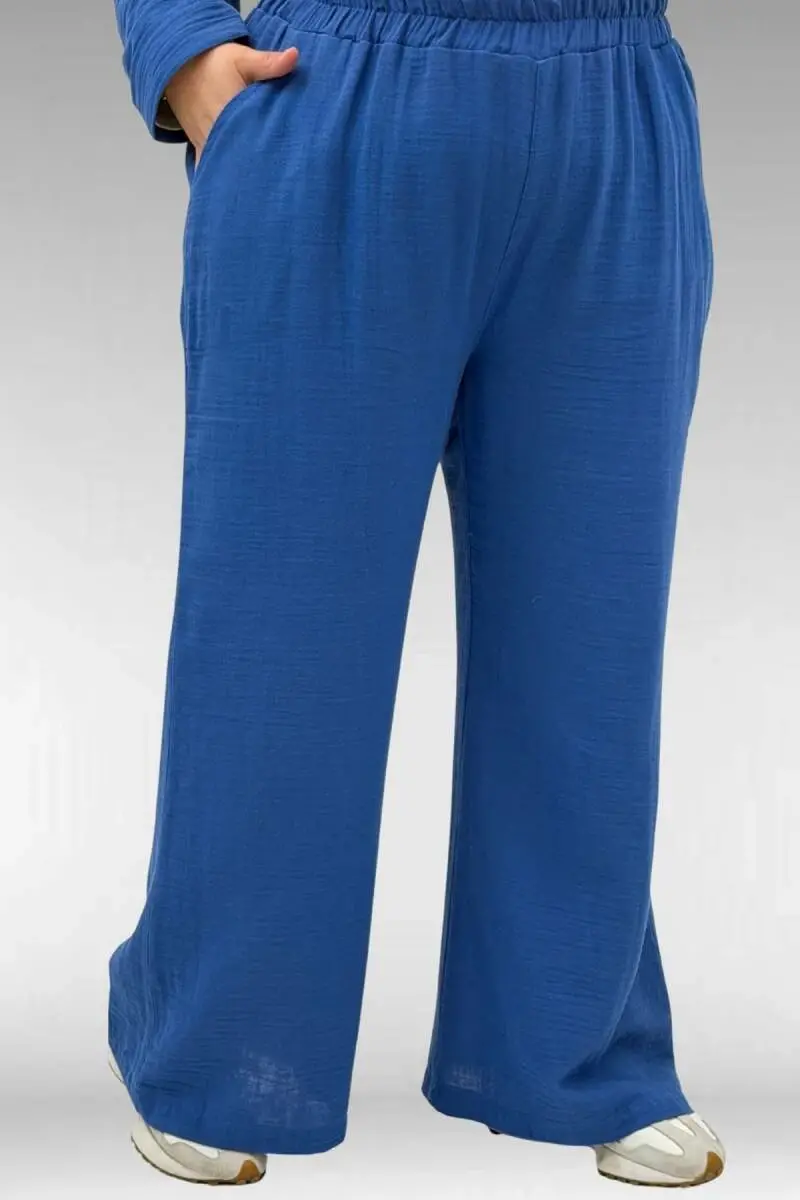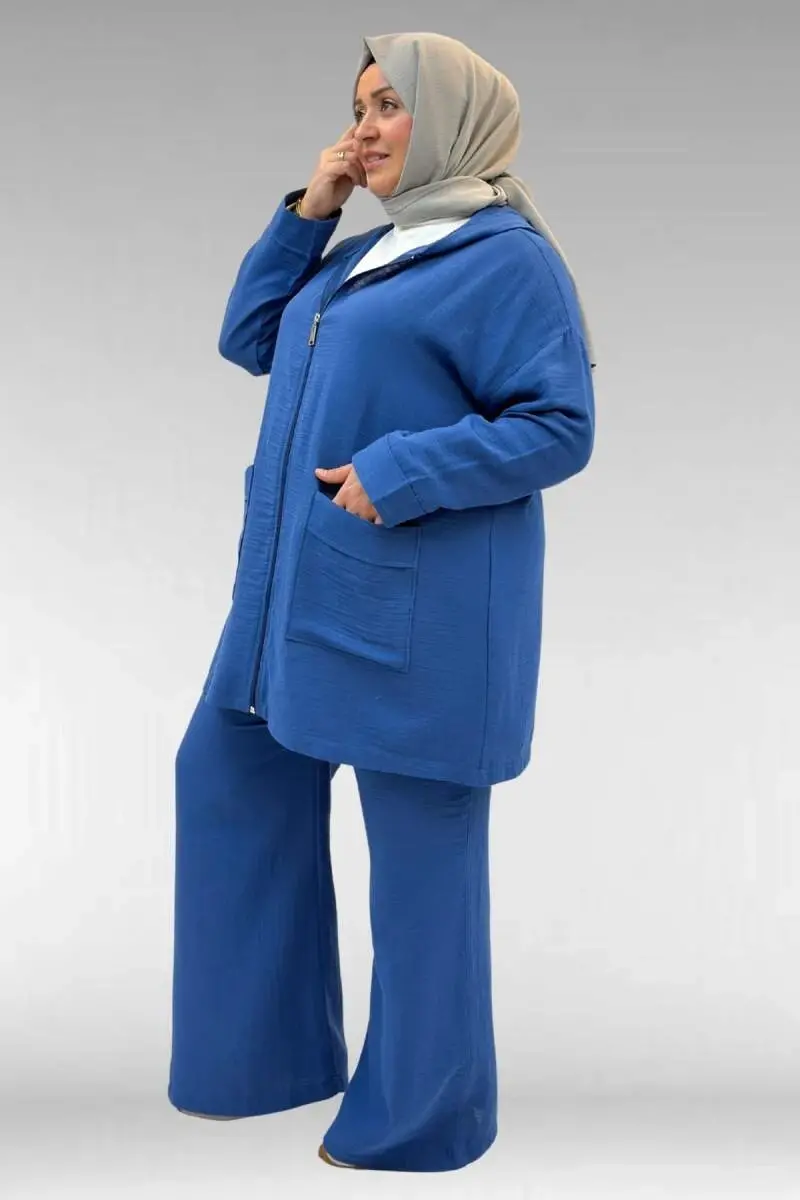 67035 Büyük Beden Kapşonlu Fermuarlı Müslin Pantolonlu Takım - İndigo