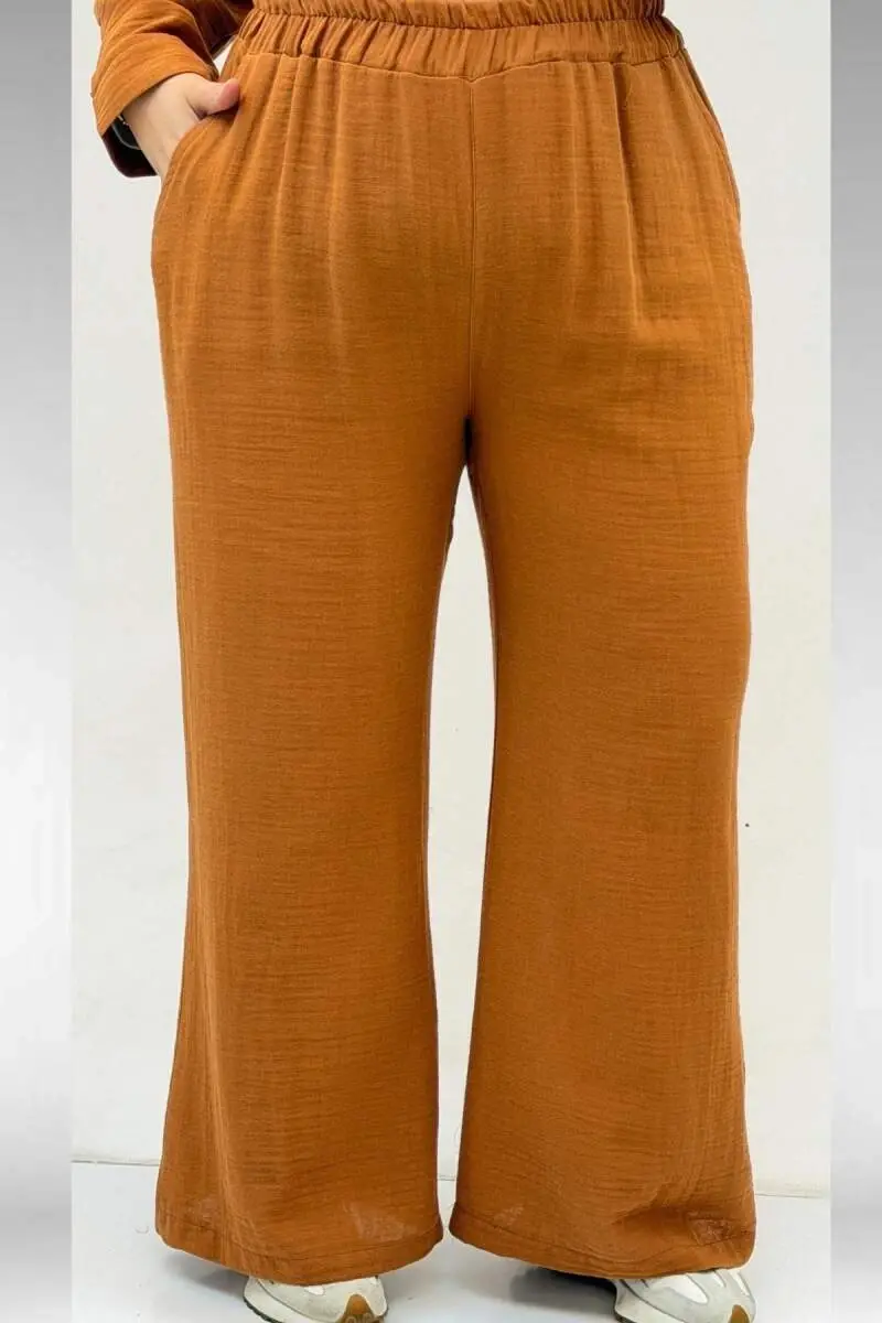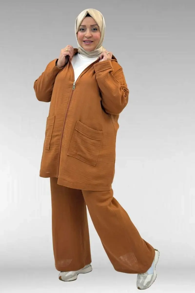 67035 Büyük Beden Kapşonlu Fermuarlı Müslin Pantolonlu Takım - Tarçın