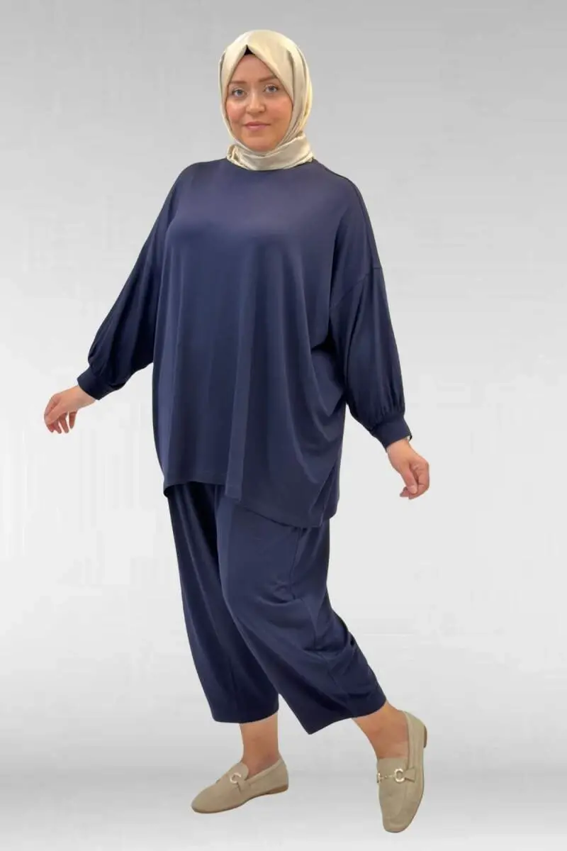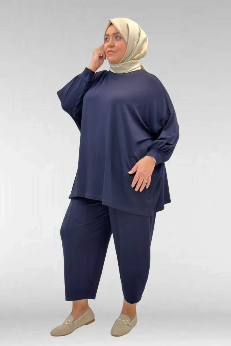 67037 Büyük Beden Düşük Kol Penye Pantolonlu Takım - Lacivert