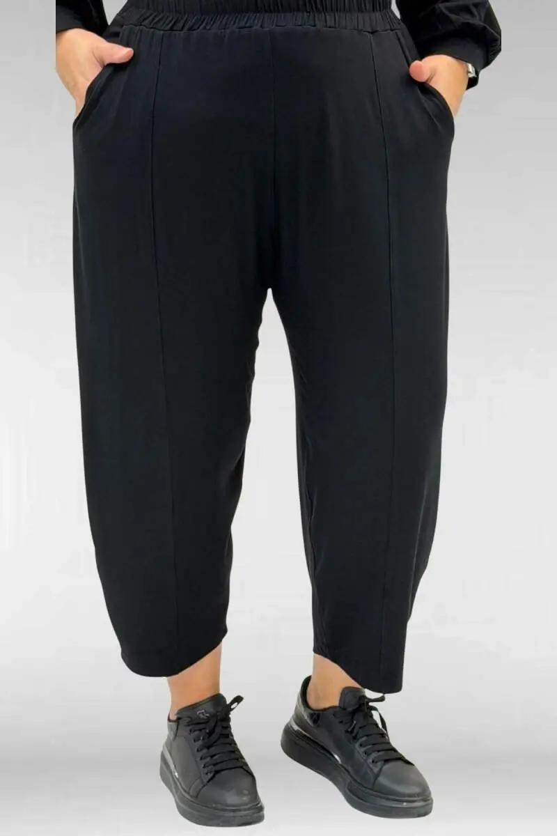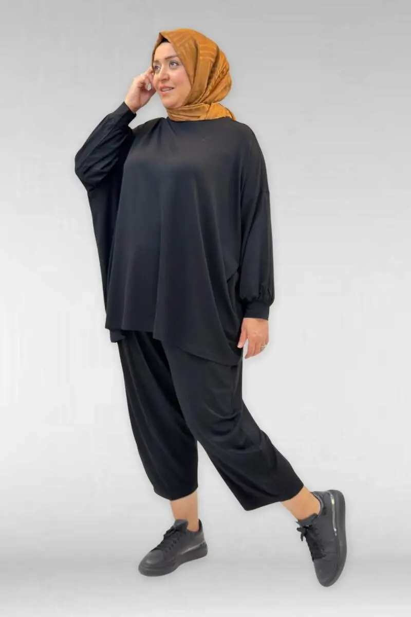 67037 Büyük Beden Düşük Kol Penye Pantolonlu Takım - Siyah