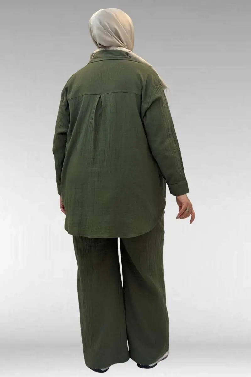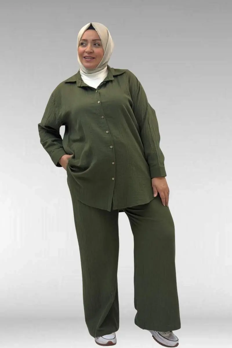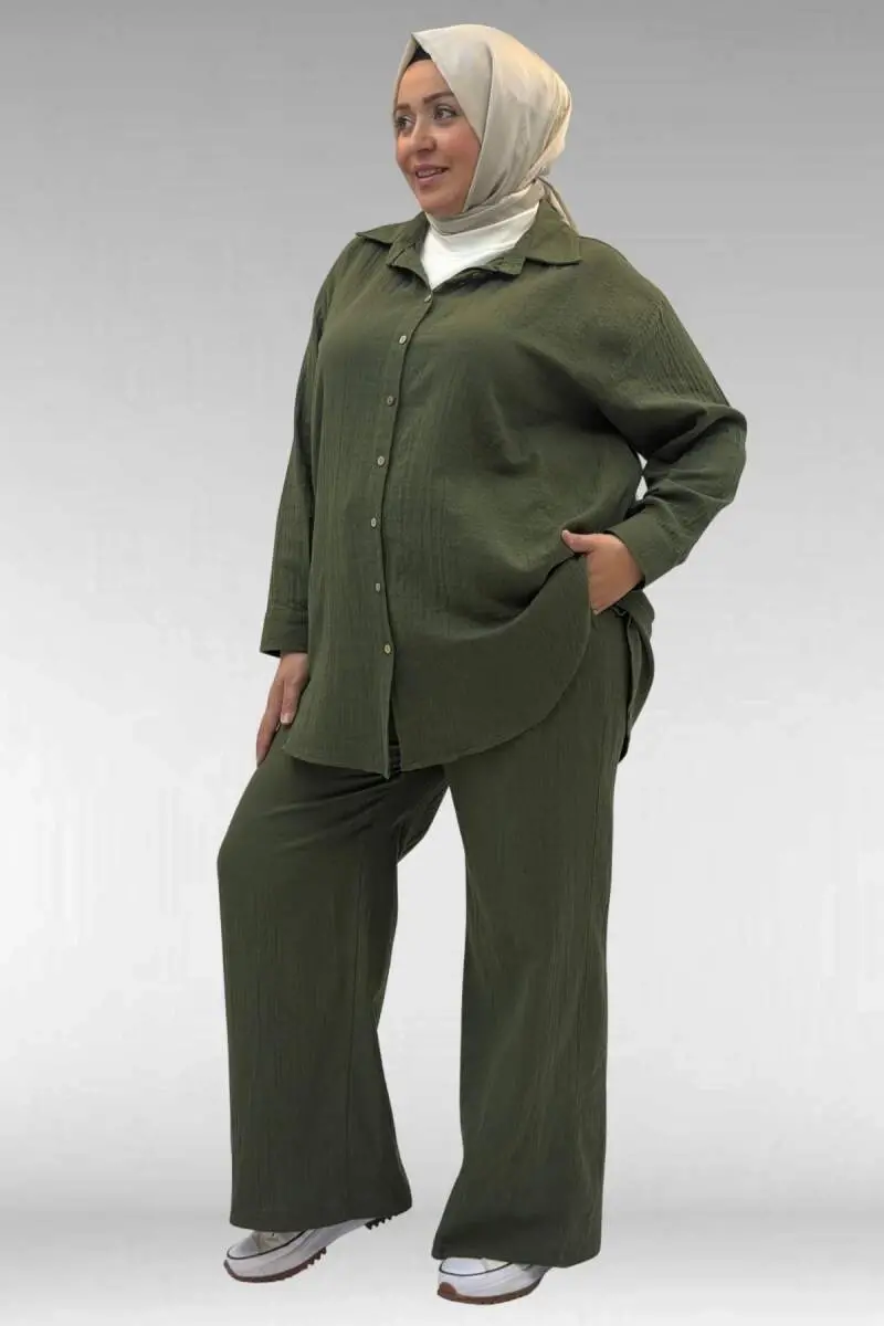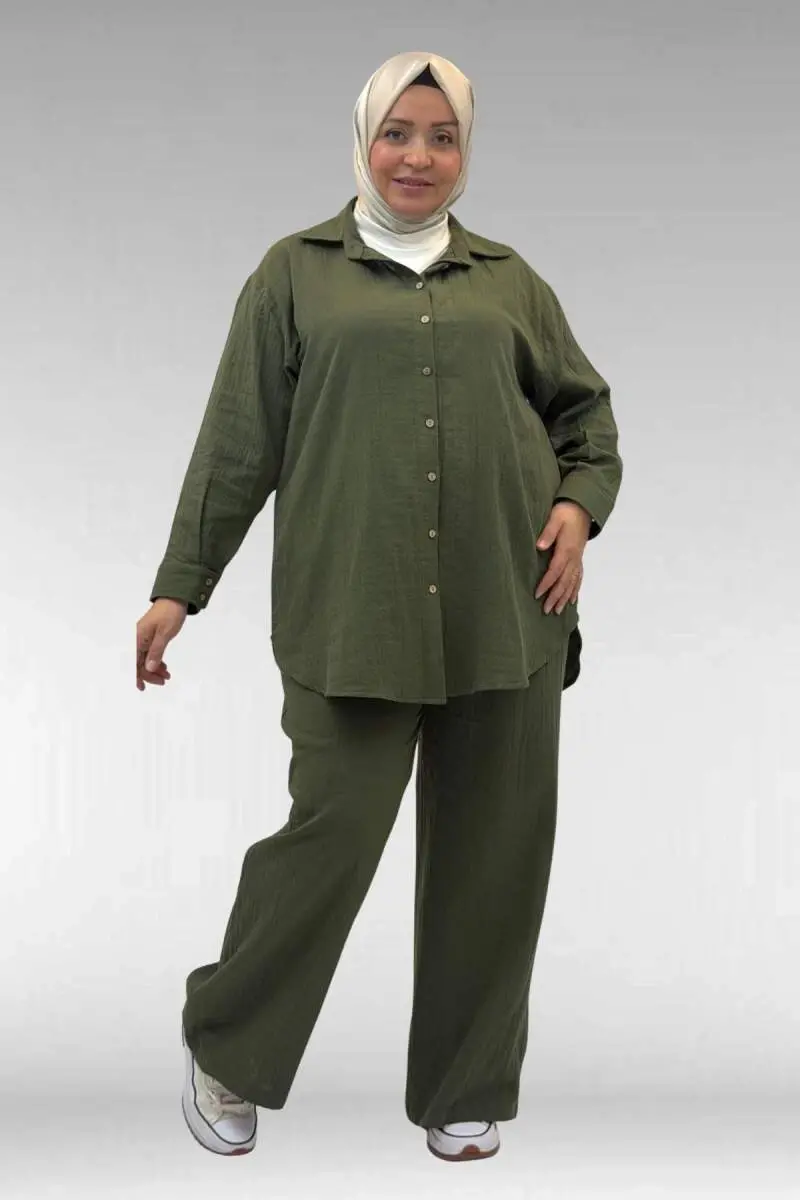 67038 Büyük Beden Erkek Yakalı Müslin Pantolonlu Takım - Haki