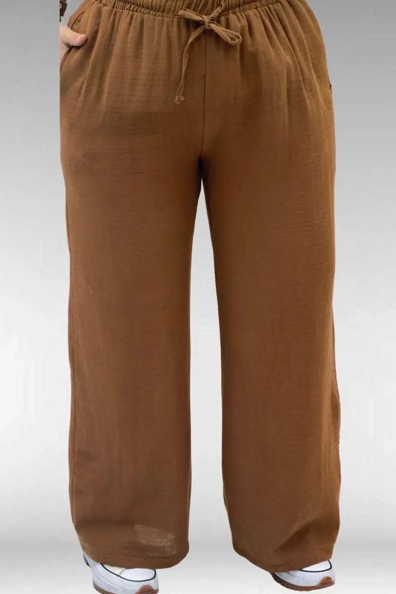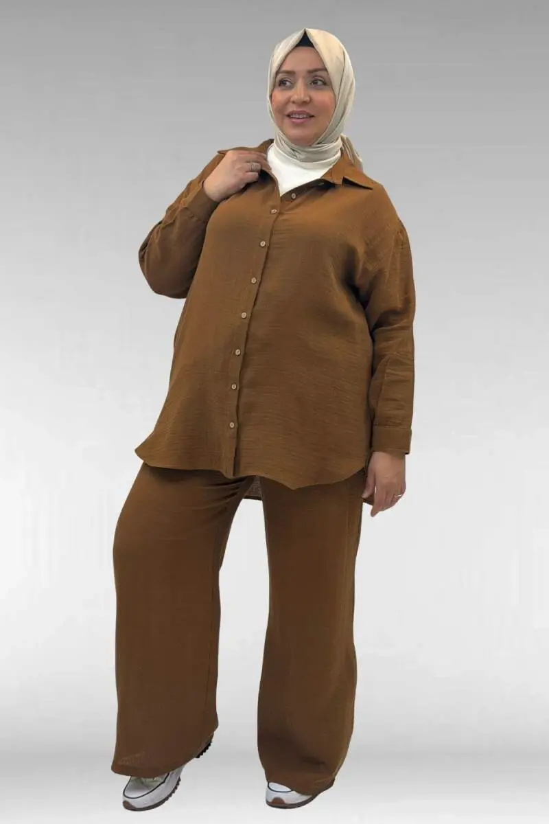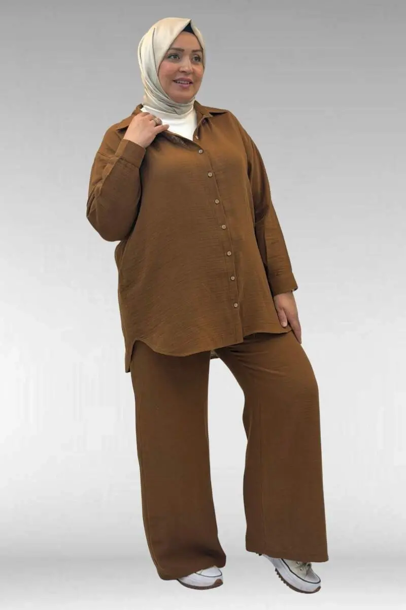 67038 Büyük Beden Erkek Yakalı Müslin Pantolonlu Takım - Kahve