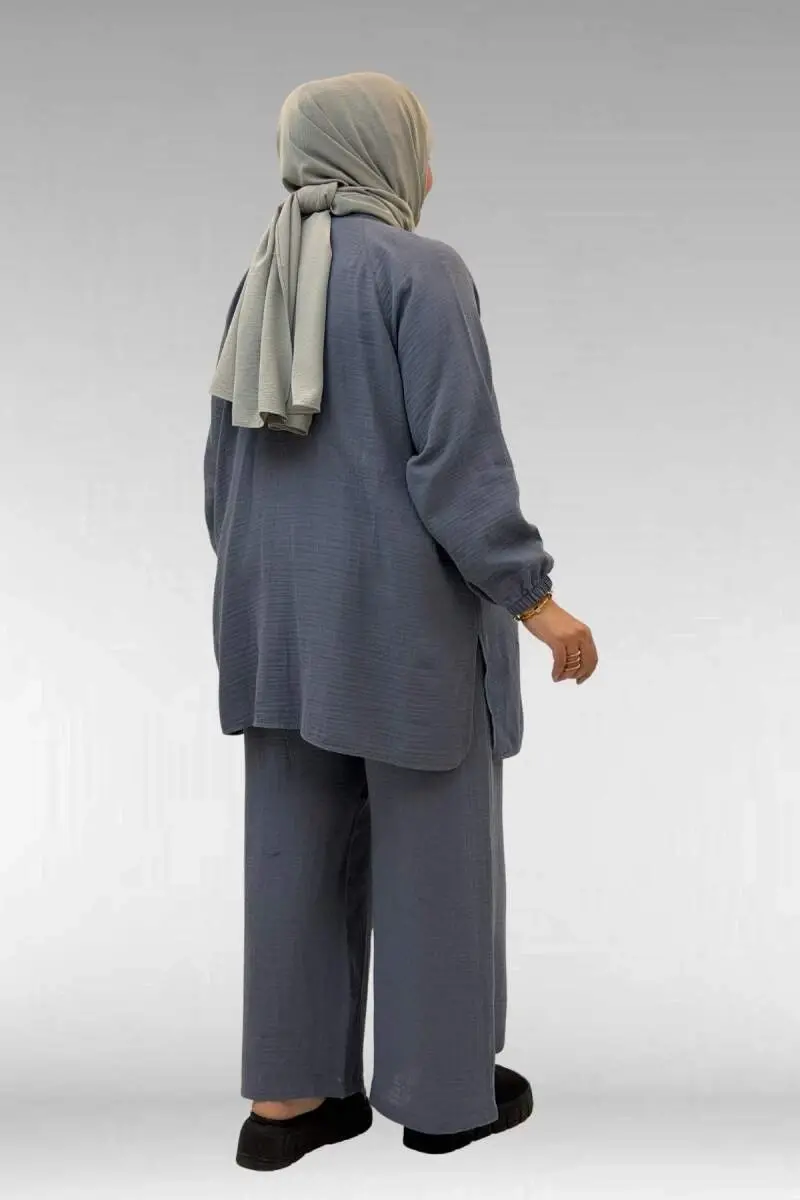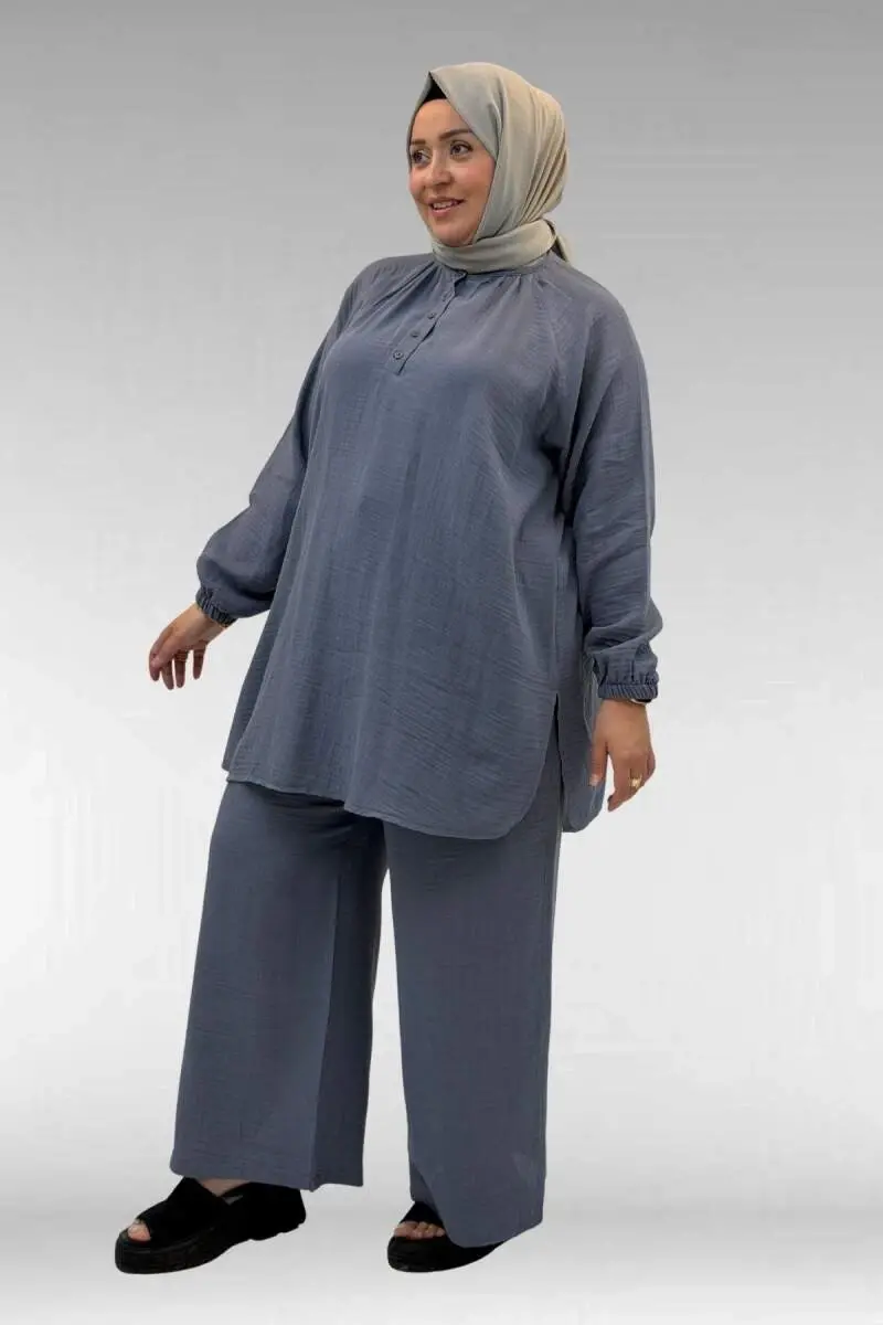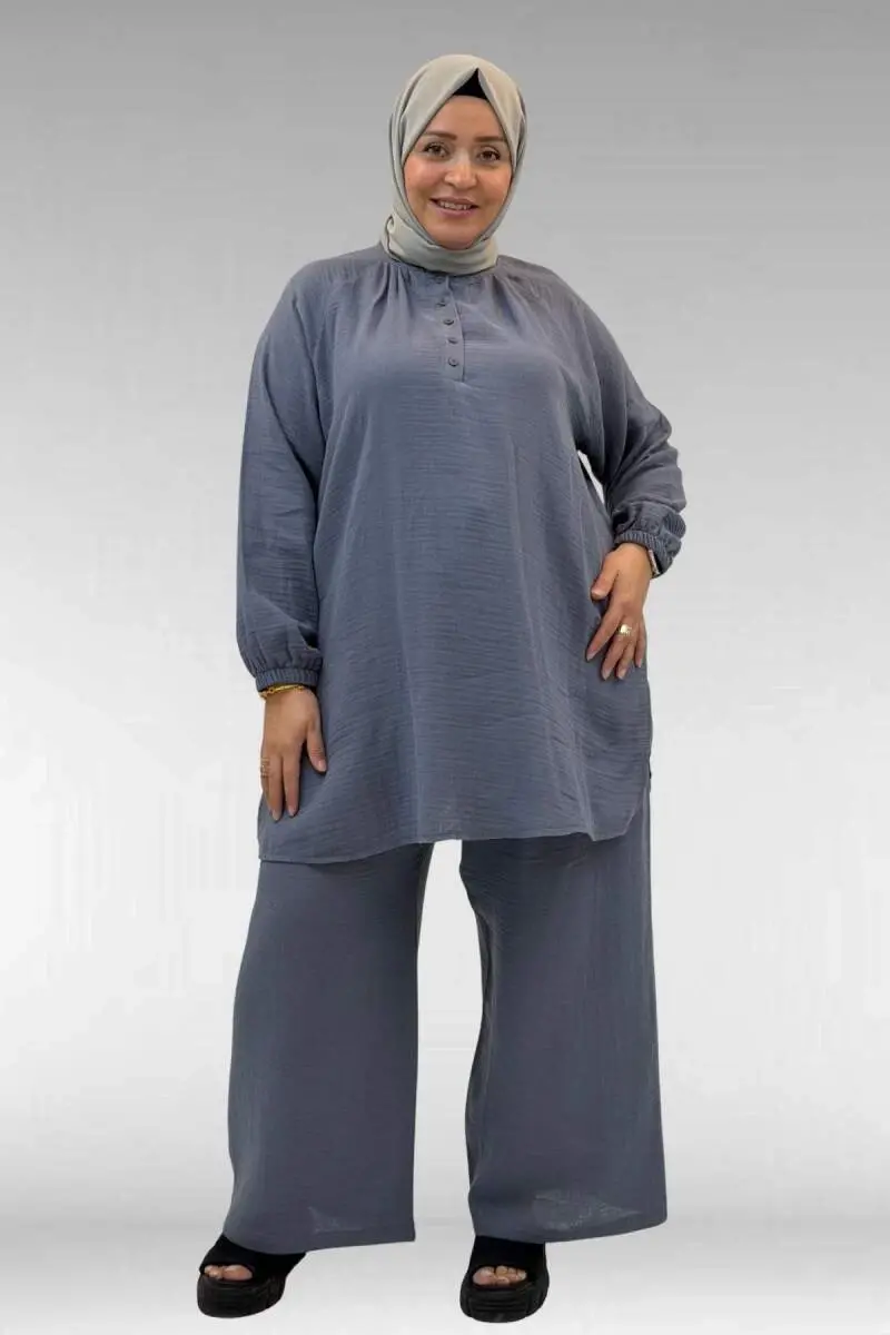 67039 Büyük Beden Yarım Patlı Sıfır Yaka Müslin Pantolonlu Takım - Antrasit