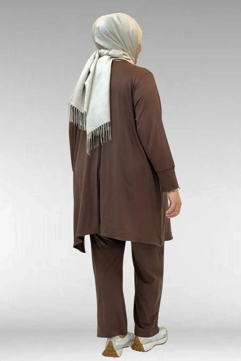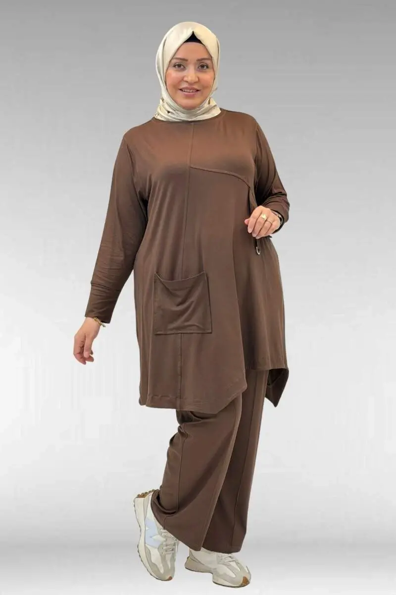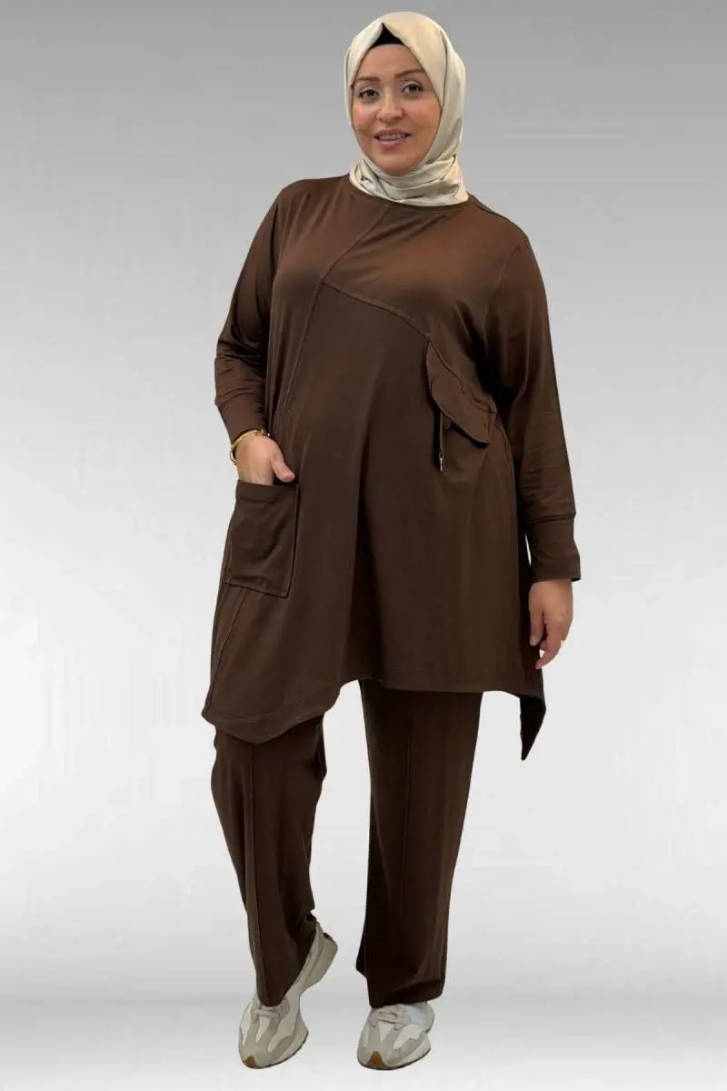 67040 Büyük Beden Cep Kapak Modelli D Halka Detaylı Penye Pantolonlu Takım - Kahve