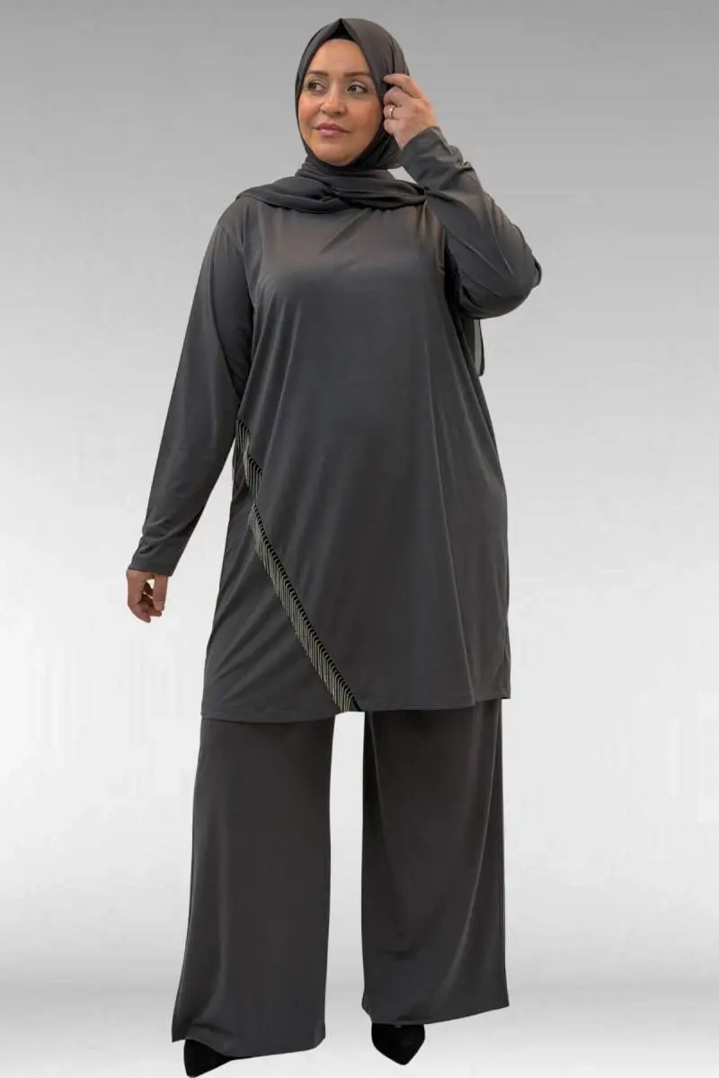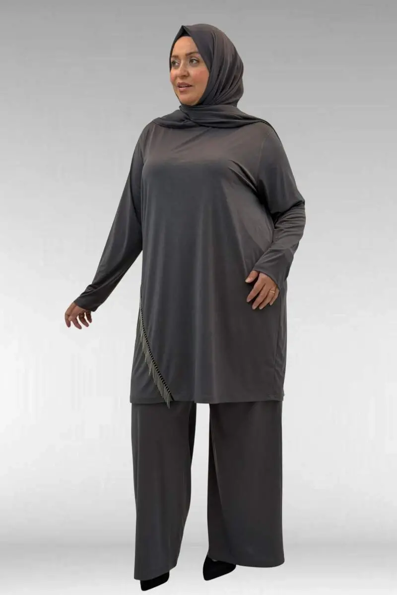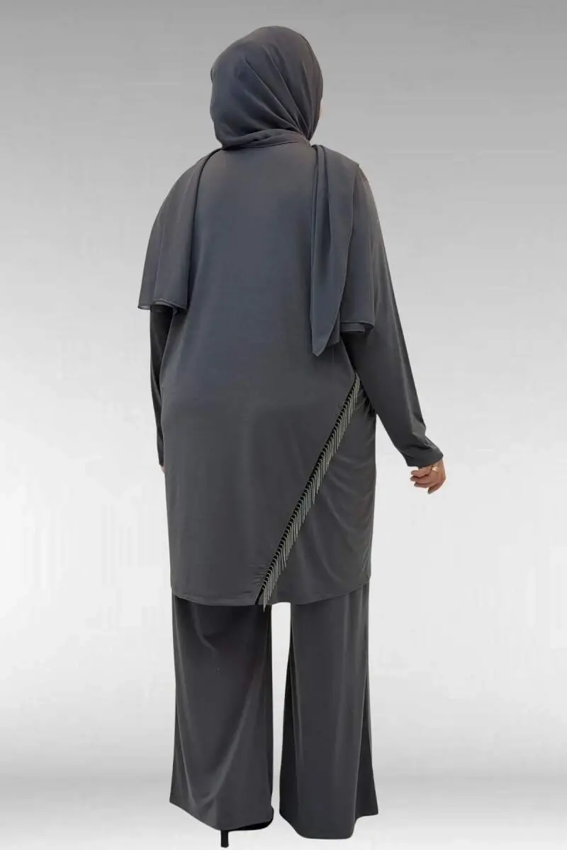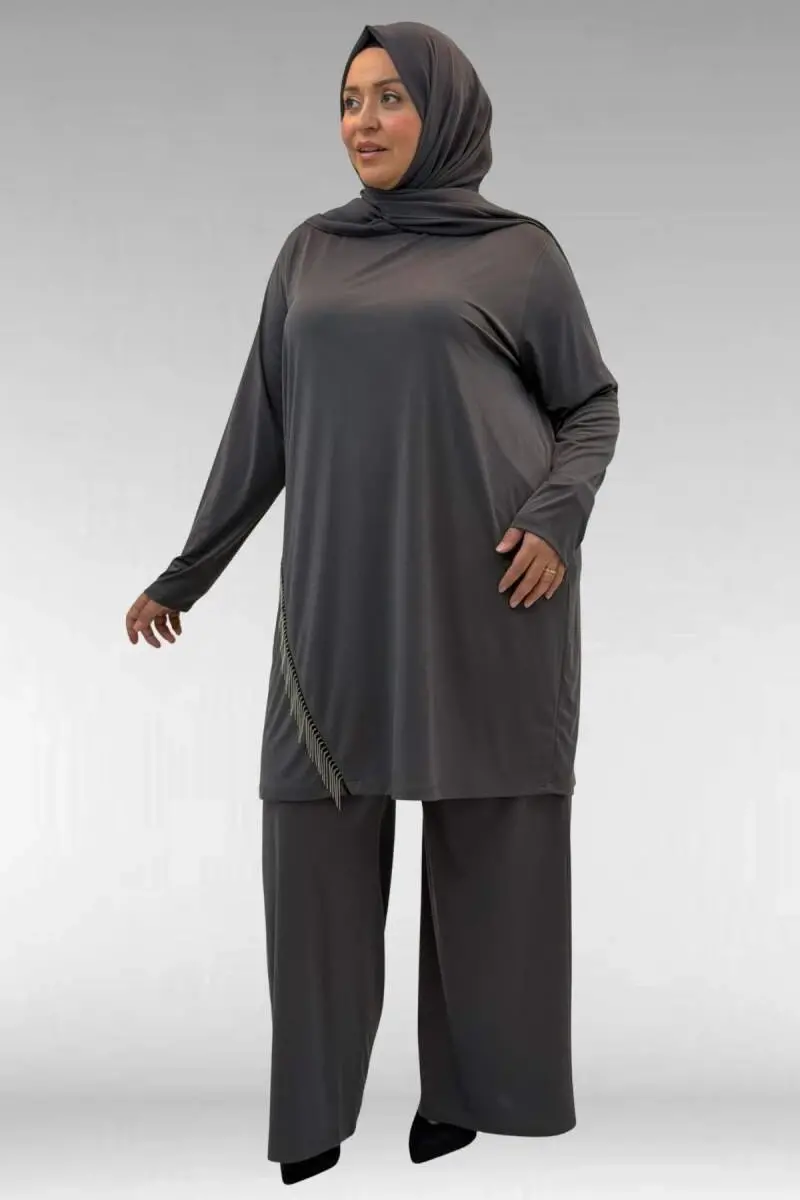 67043 Büyük Beden Püskül Detaylı Sandy Pantolonlu Takım - Antrasit