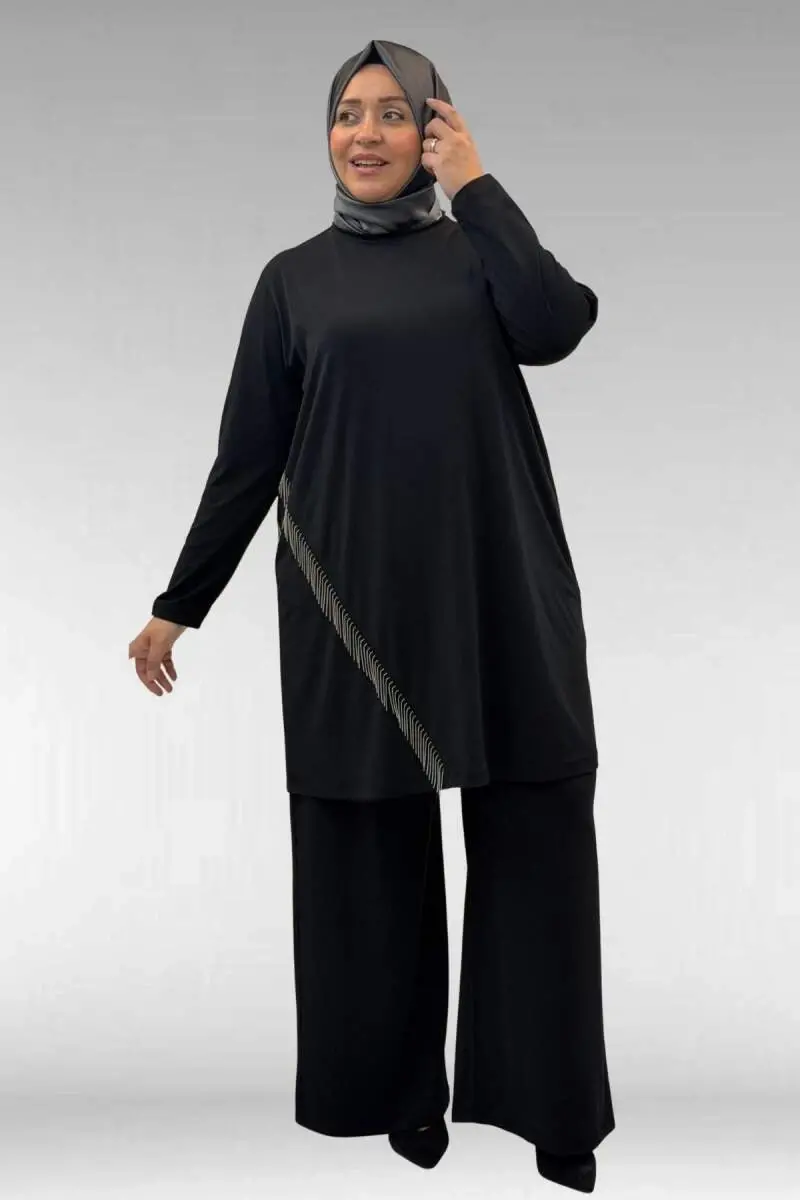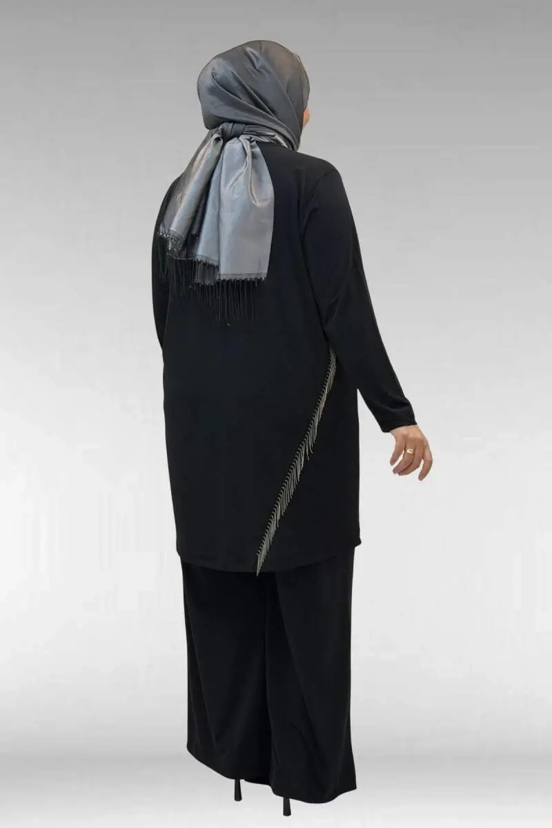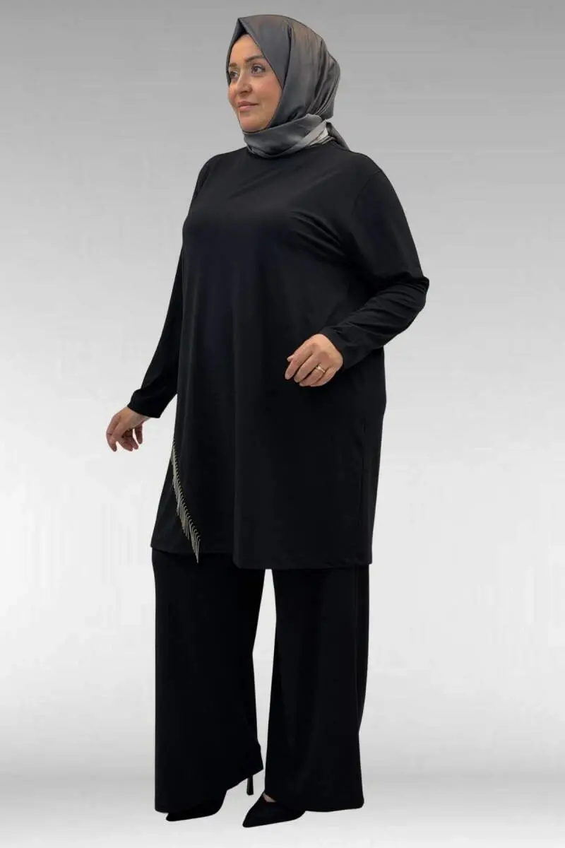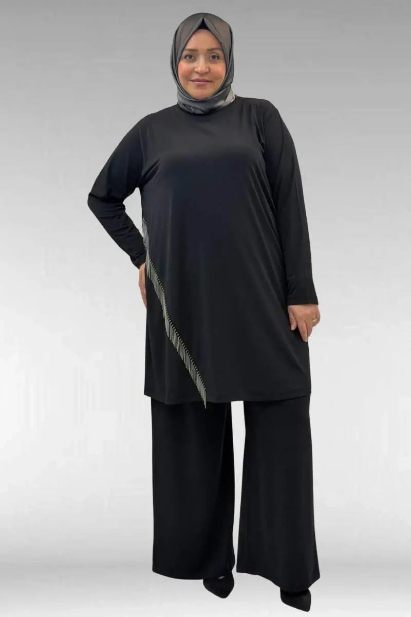 67043 Büyük Beden Püskül Detaylı Sandy Pantolonlu Takım - Siyah