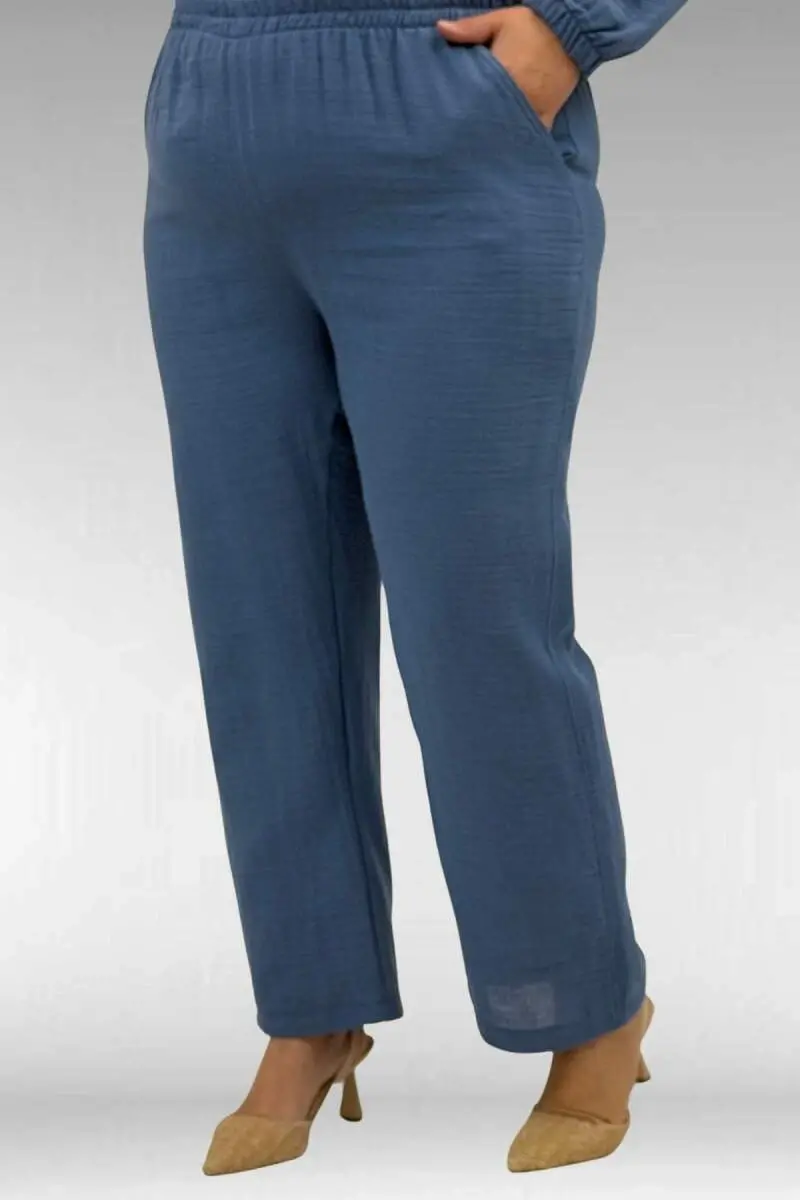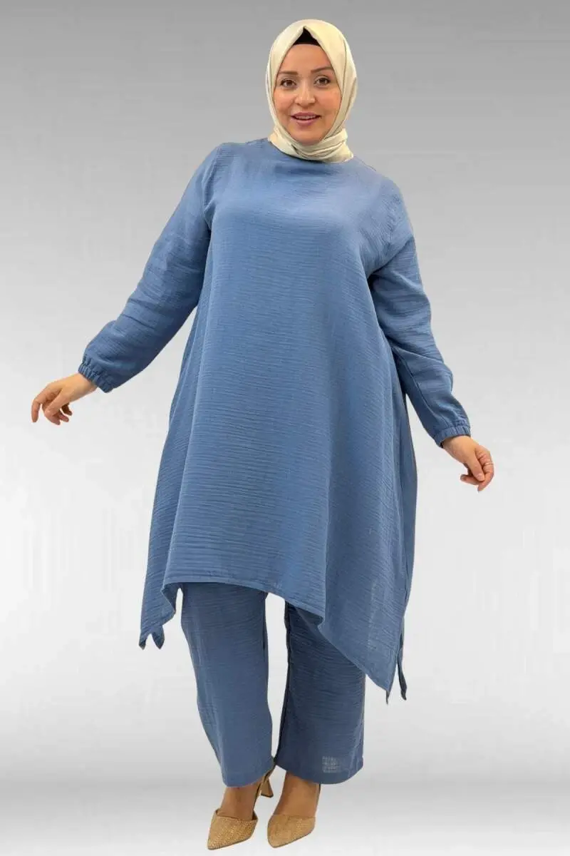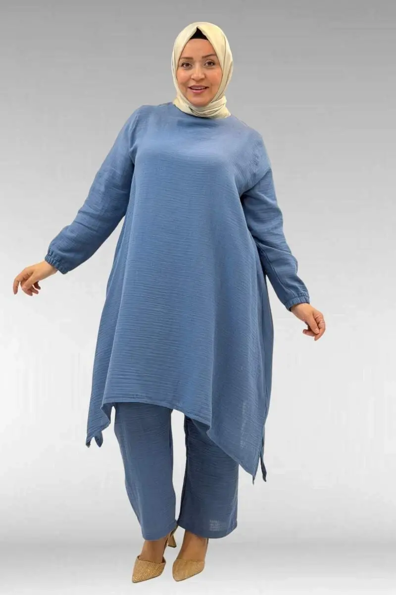 67044 Büyük Beden Asimetrik Kesim Pantolonlu Müslin Takım - Soğuk Mavi