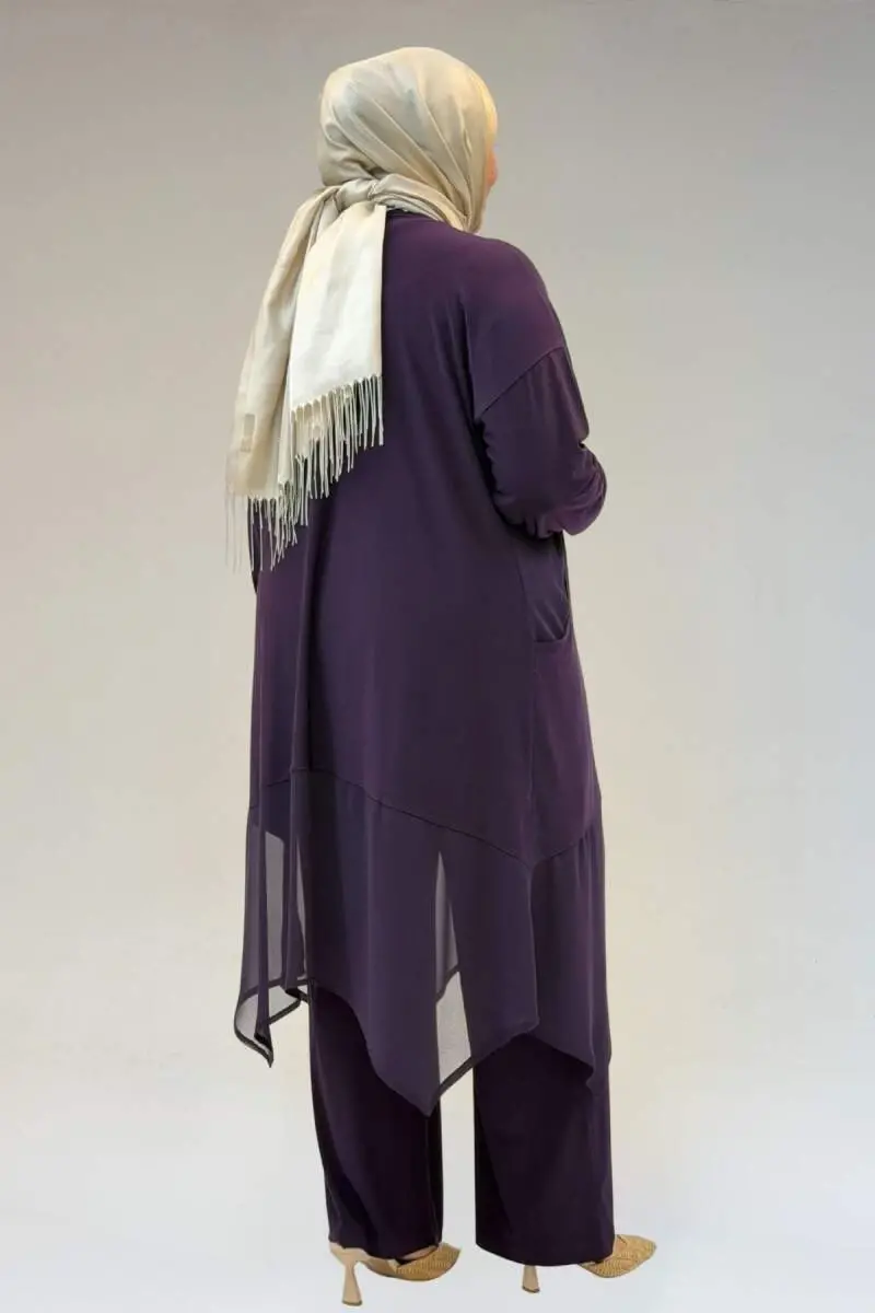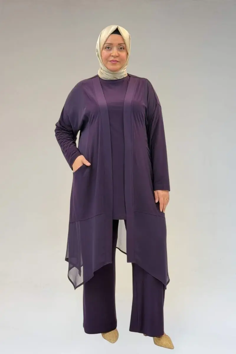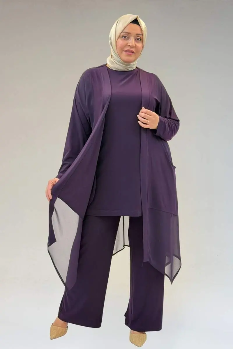 67302 Büyük Beden Üçlü Sandy - Şifon Pantolonlu Takım - Mor