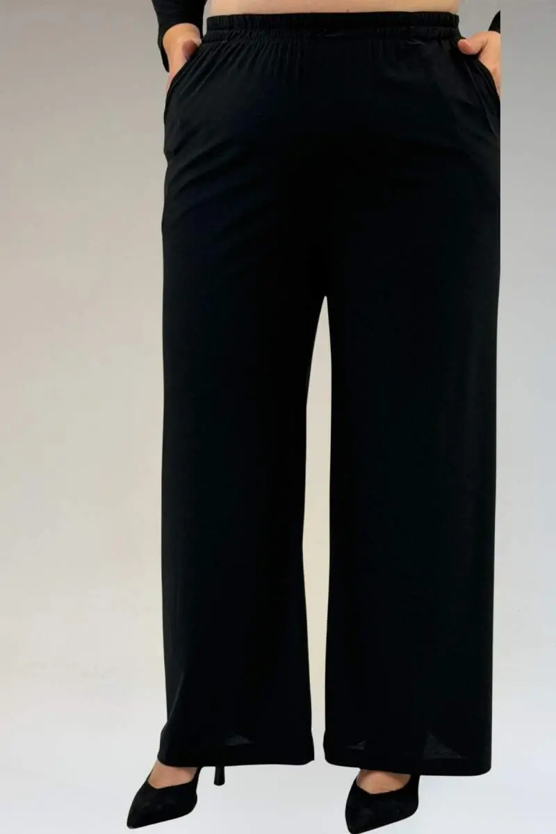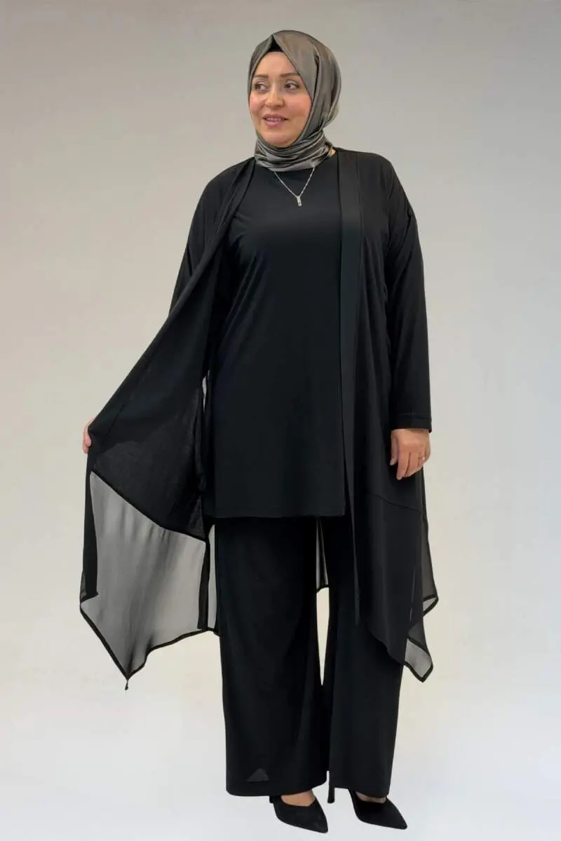 67302 Büyük Beden Üçlü Sandy - Şifon Pantolonlu Takım - Siyah