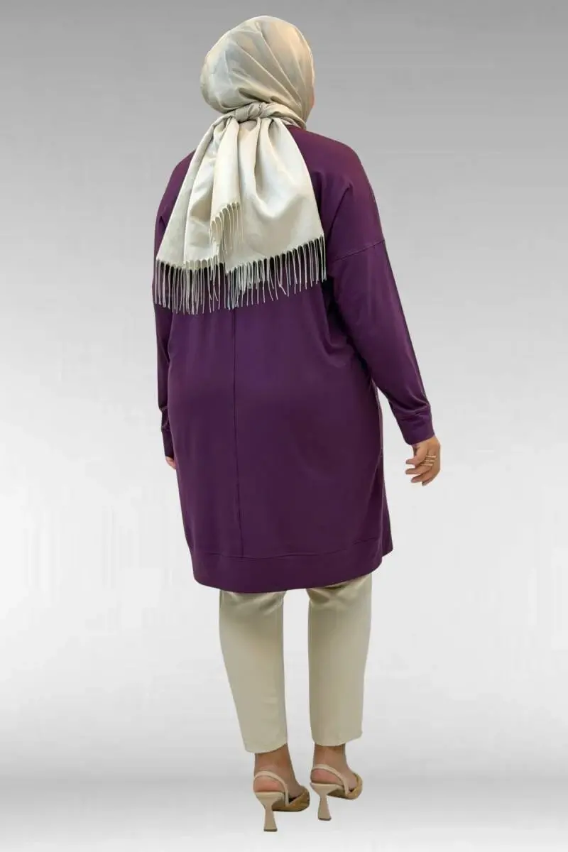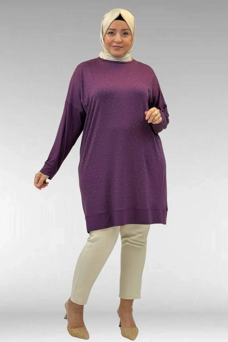 68001 Büyük Beden Önü Taş Baskı Detaylı Penye Tunik - Mürdüm