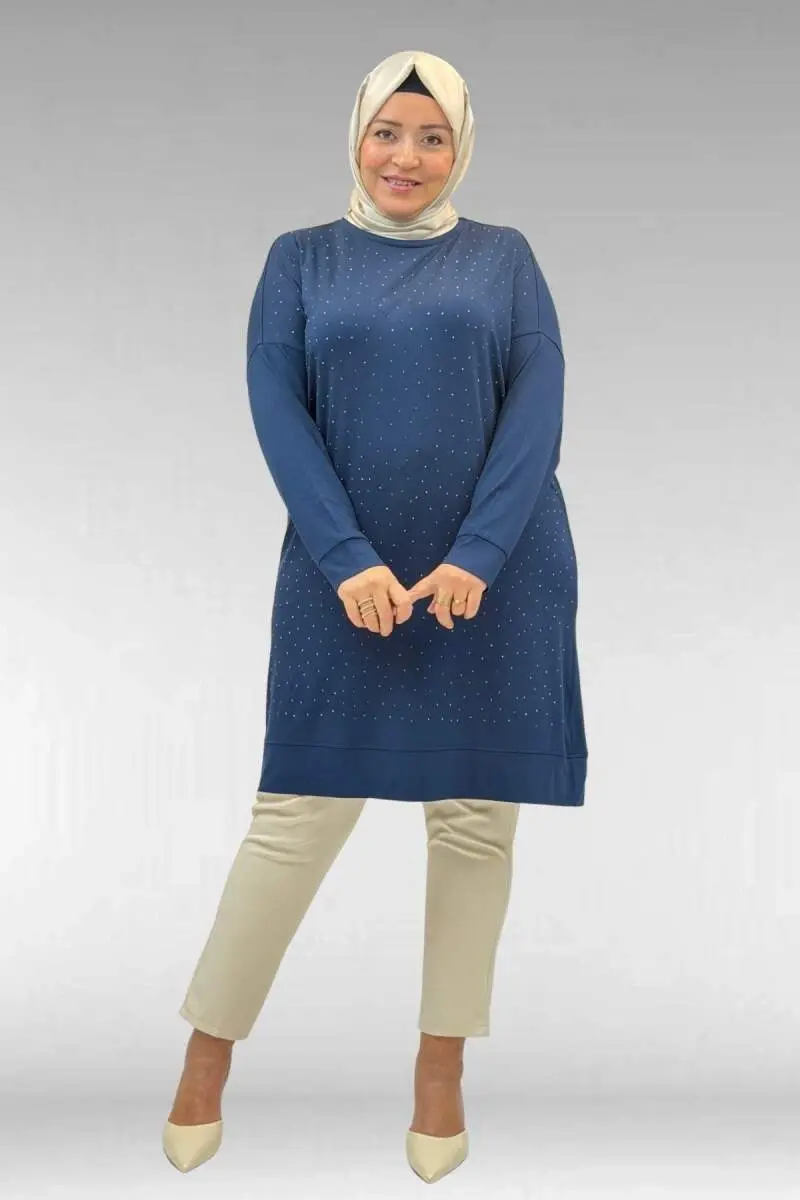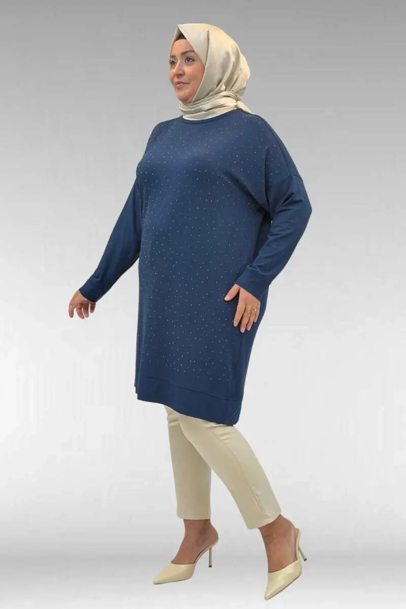 68001 Büyük Beden Önü Taş Baskı Detaylı Penye Tunik - Petrol