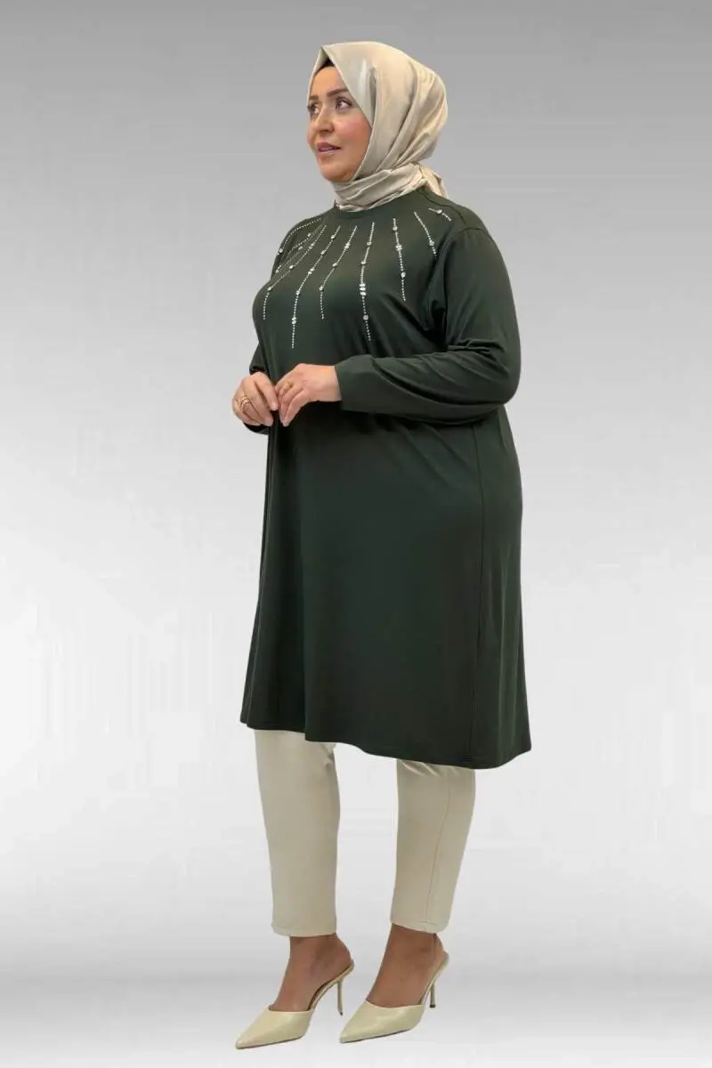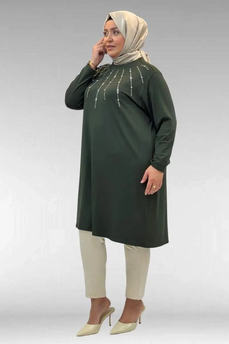 68002 Büyük Beden Önü Güneş Parıltılı Taş Baskılı Penye Tunik - Haki