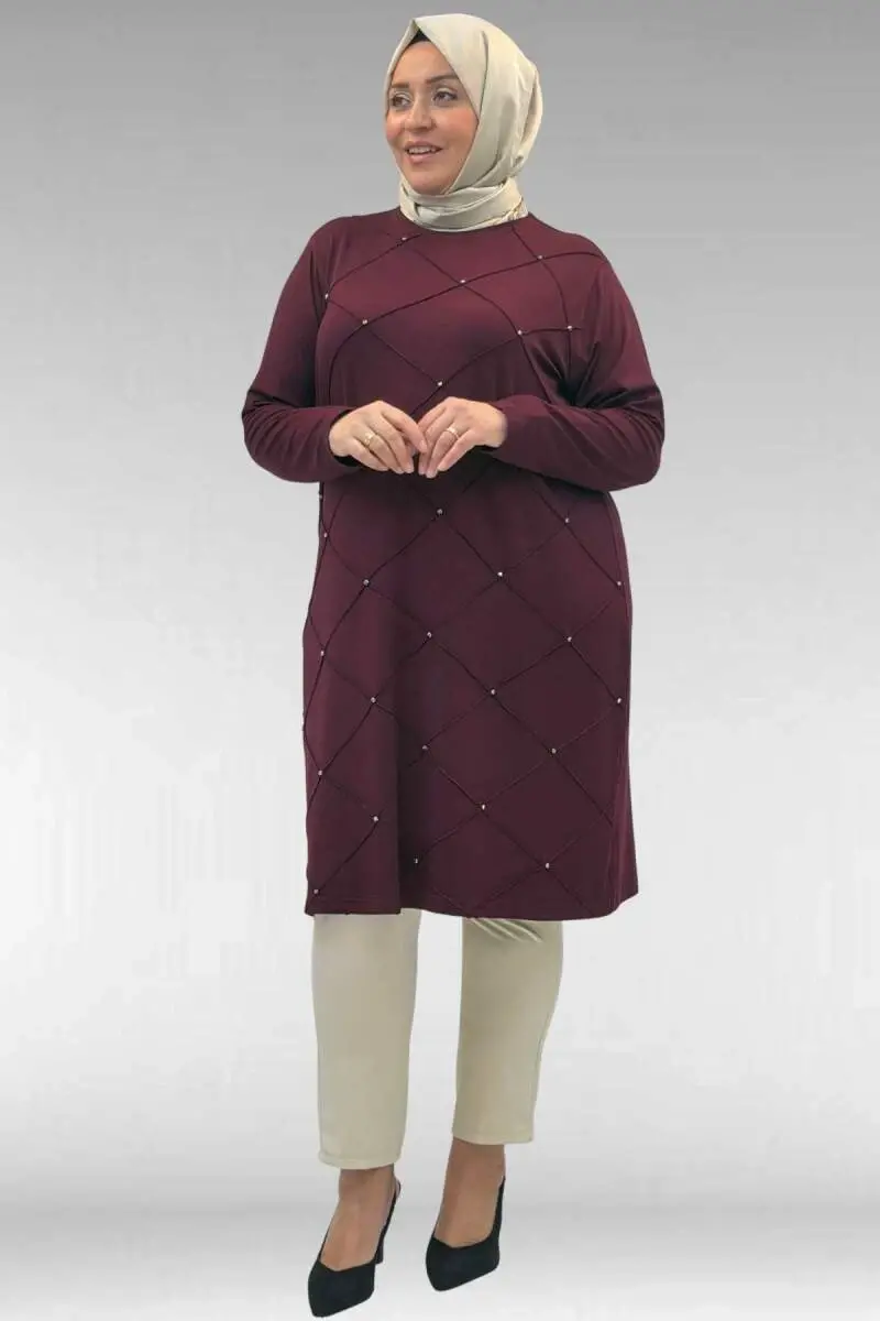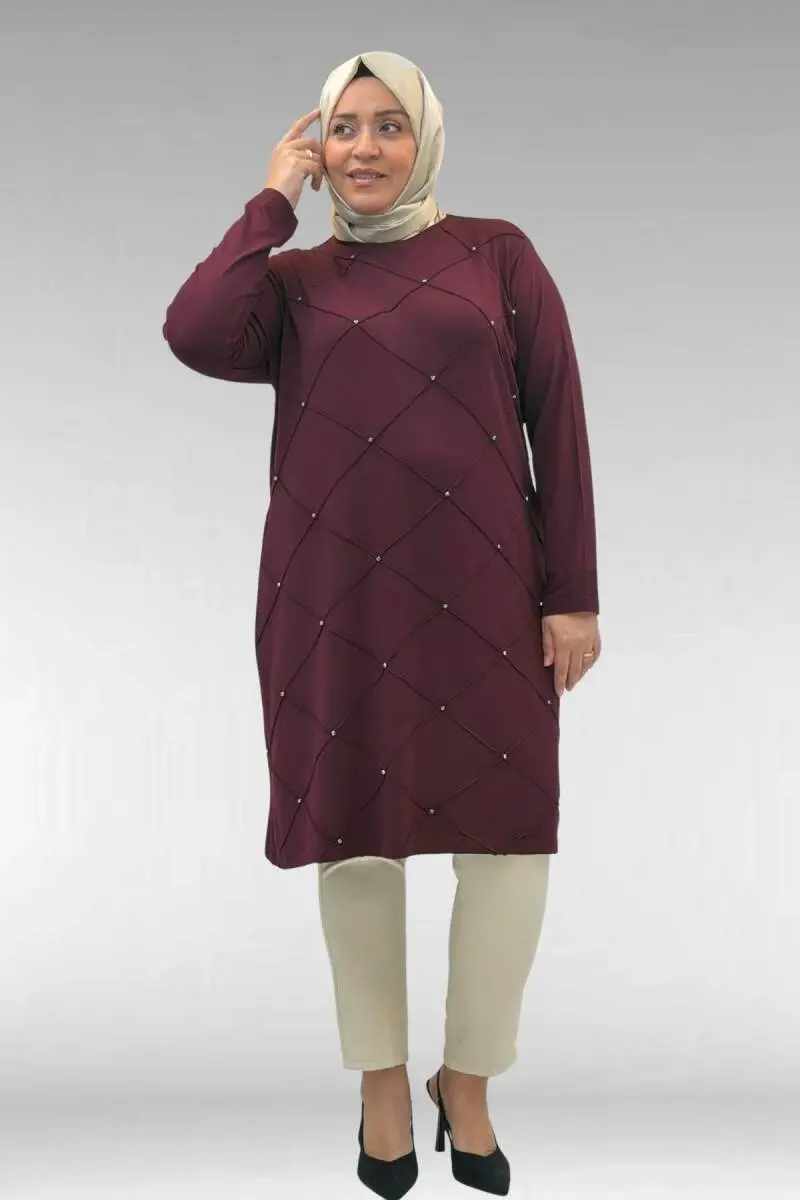 68004 Büyük Beden Çıma Detaylı Penye Tunik - Bordo