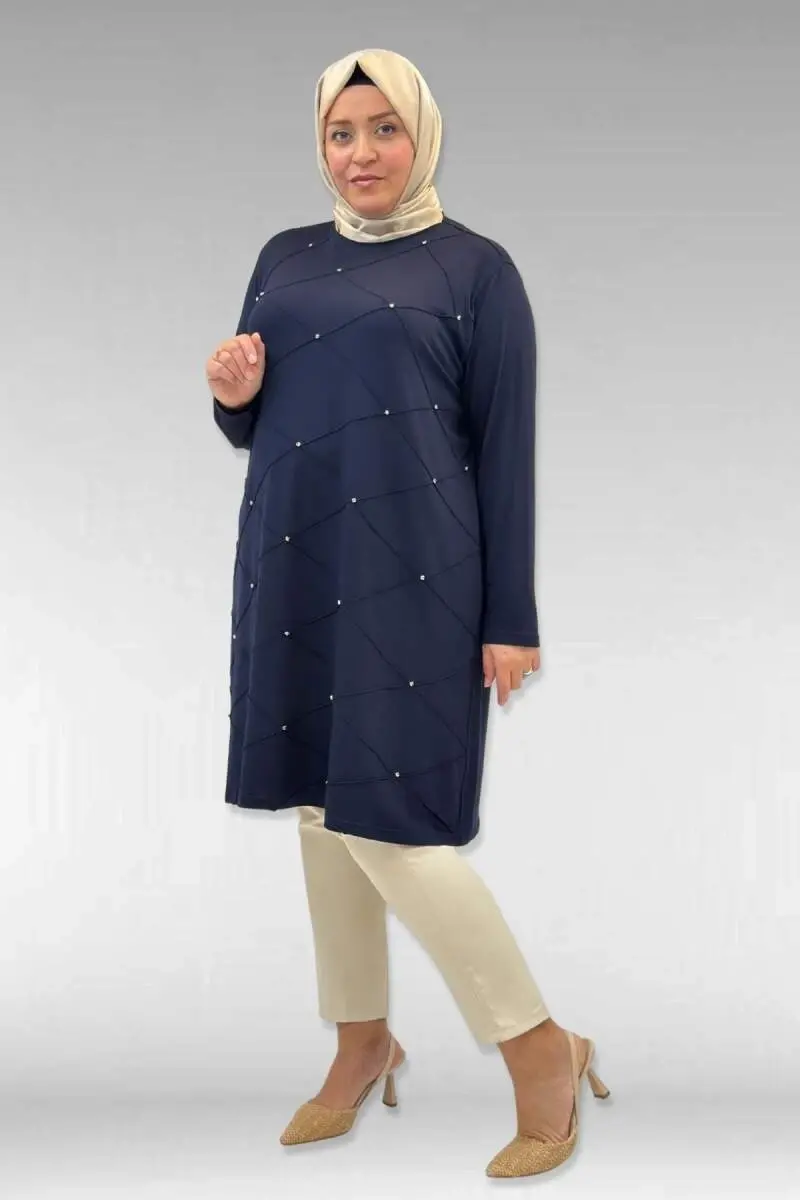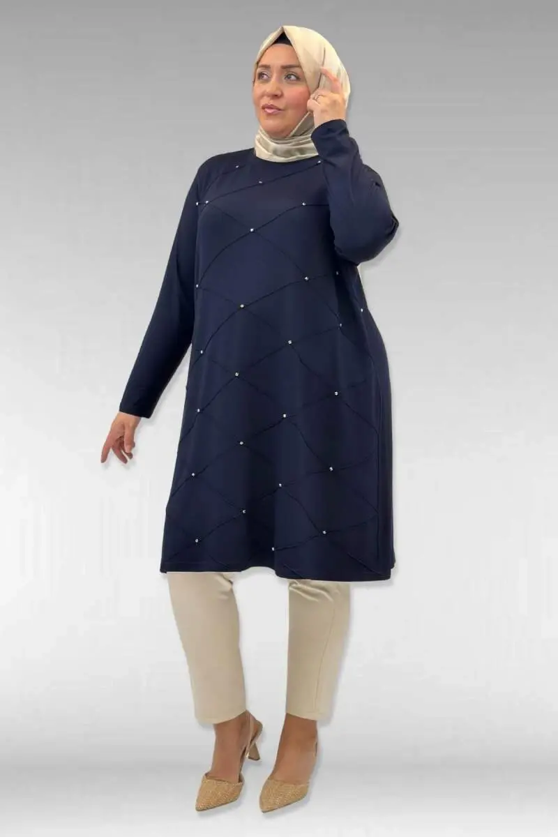 68004 Büyük Beden Çıma Detaylı Penye Tunik - Lacivert