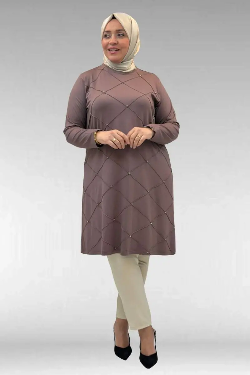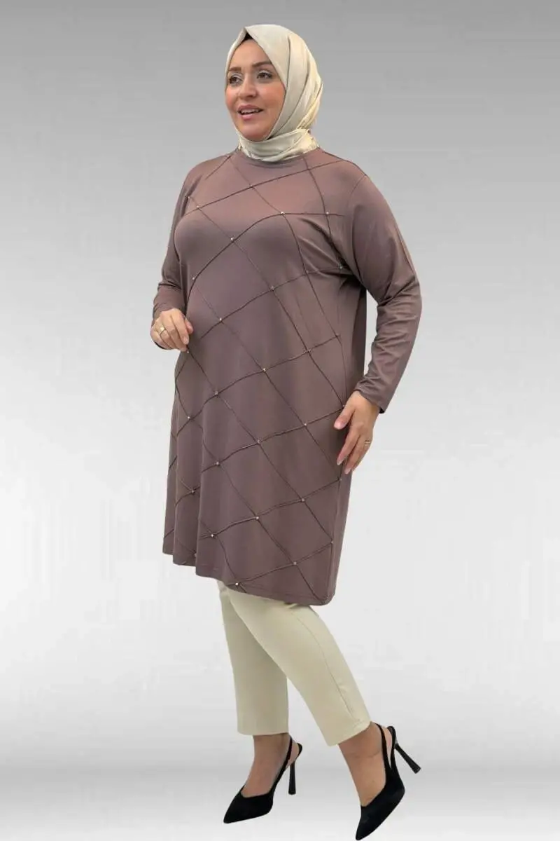 68004 Büyük Beden Çıma Detaylı Penye Tunik - Vizon