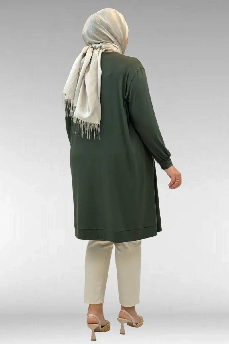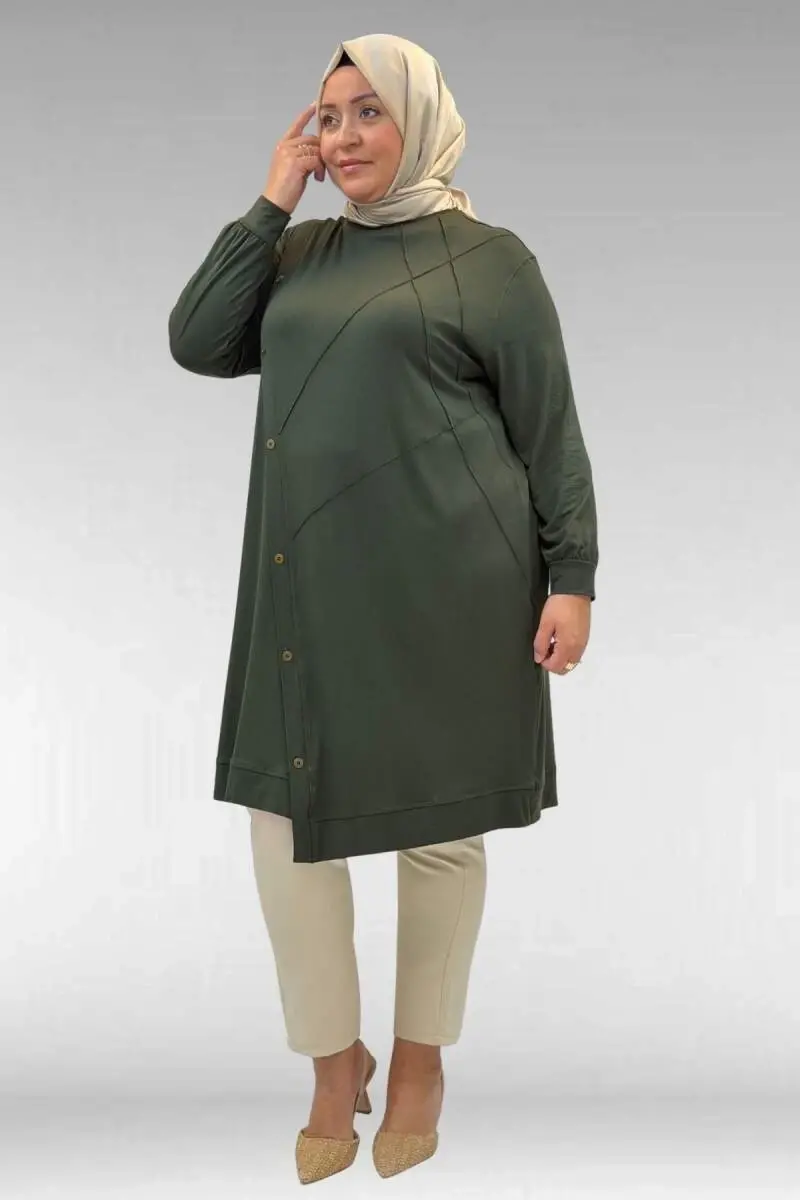 68006 Büyük Beden Pat Üzeri Düğme Detaylı Penye Tunik - Haki
