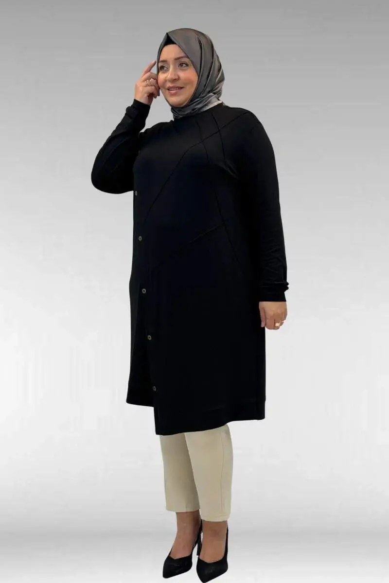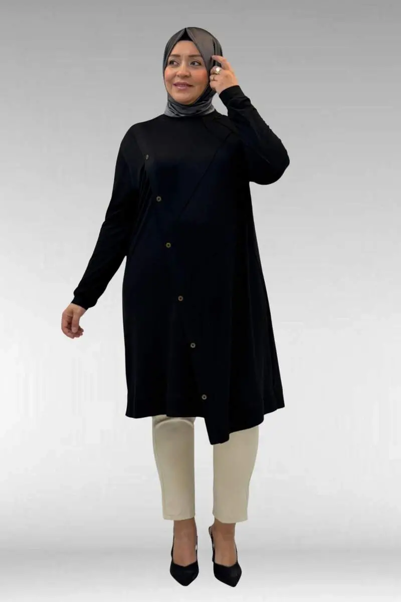 68006 Büyük Beden Pat Üzeri Düğme Detaylı Penye Tunik - Siyah