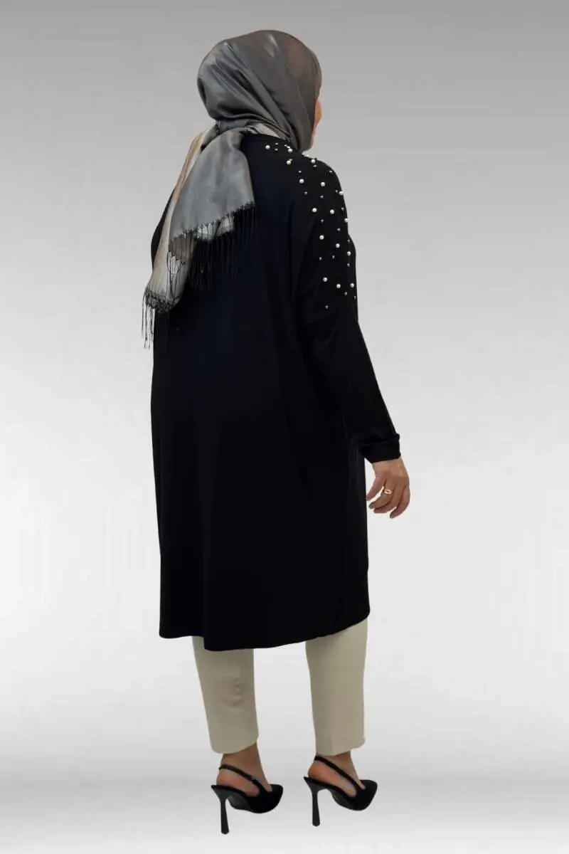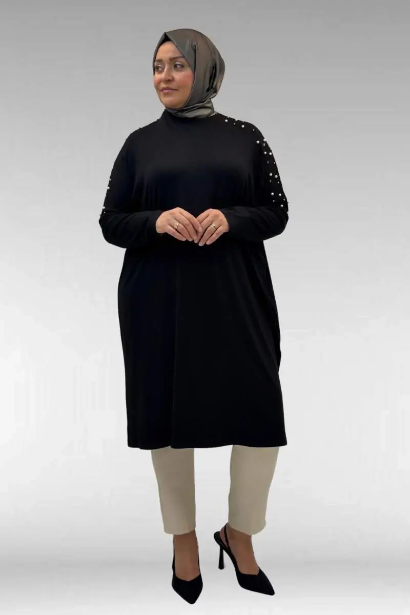 68012 Büyük Beden Omuzları Taş Detaylı Penye Tunik - Siyah