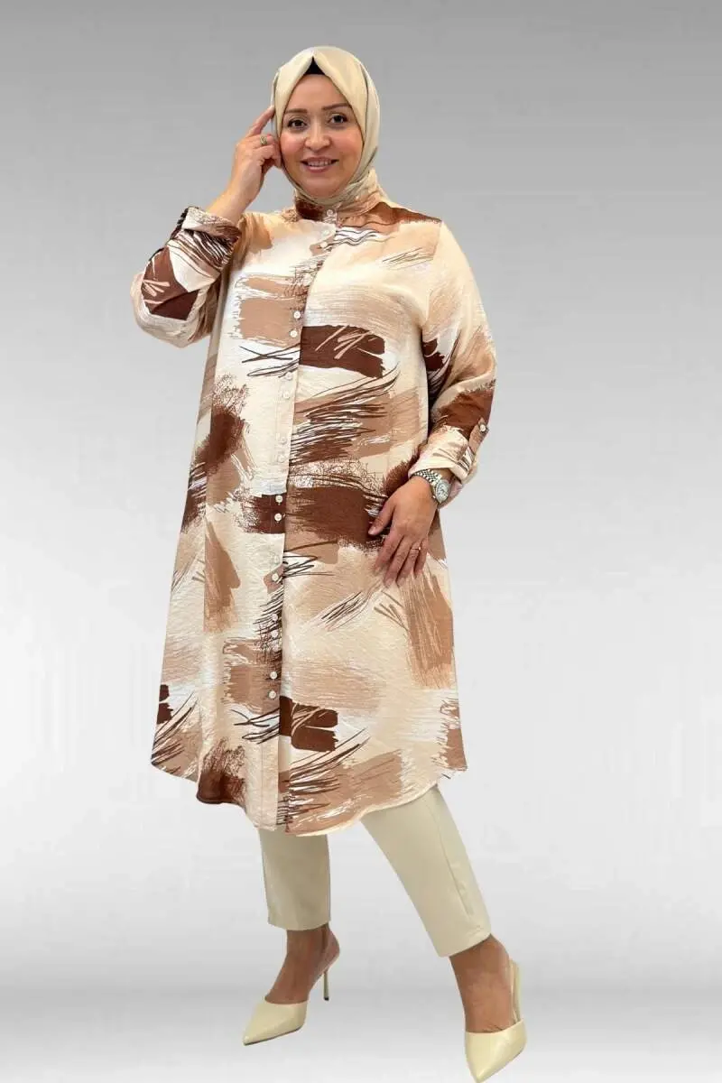 68014 Büyük Beden Hakimyaka Çift Düğmeli Mango Tunik - Desenli Çikolata Kahve