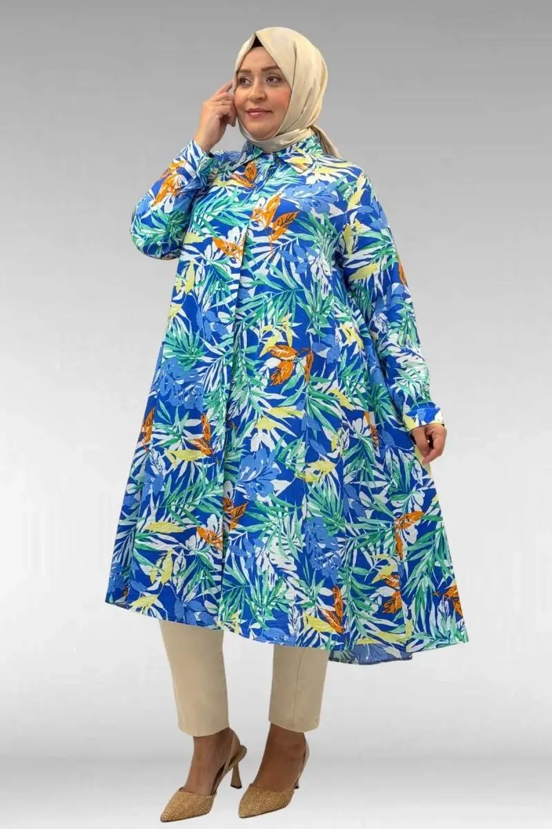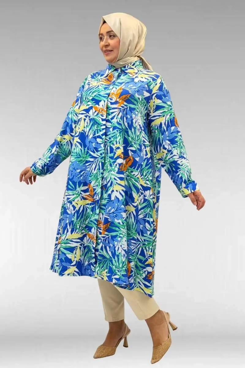 68015 Büyük Beden Mevlana Kesim Mango Gömlek - Desenli Saks