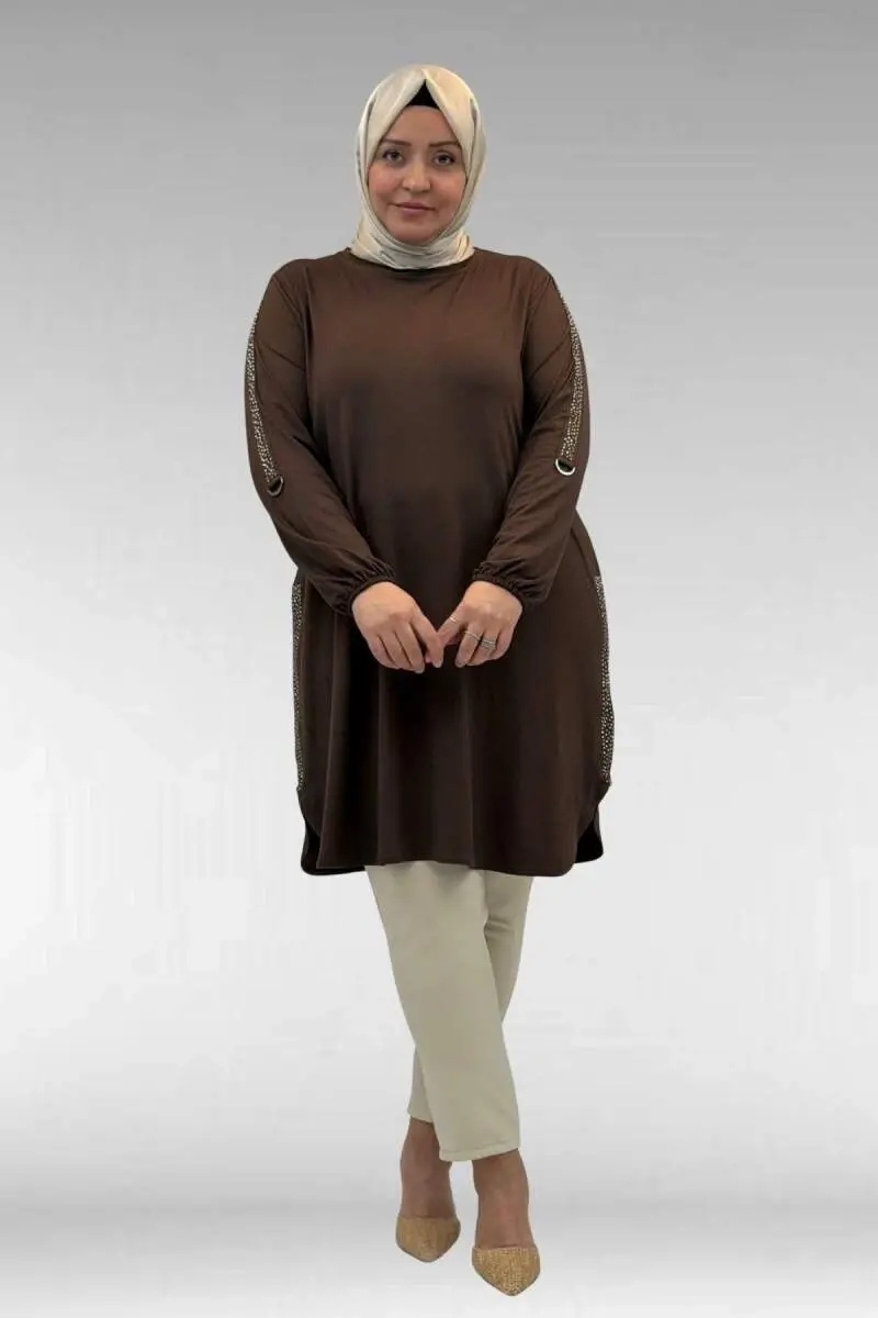 68016 Plus Size Cotton Tunic with Stone Details on the Sides is a candidate to be the most stylish and comfortable piece in your wardrobe. It is specially designed for plus-size women who do not want to compromise on comfort in their daily lives but also want to draw attention with their elegance. Adding elegance to your outfits with the warm and noble tone of brown, this tunic gains a modern look with the aesthetic stone details on the sides. Thanks to its special fabric structure made of a cotton and viscose blend, it leaves a soft touch on your skin all day long. Its flexible structure provides excellent ease of use without restricting your movement during the day. Produced in accordance with the lightness of spring and summer months, this piece helps you feel refreshed even on hot days with its non-sweating and breathable fabric technology. Its 3XL fit perfectly adapts to your body lines, giving you a more balanced and elegant appearance. Whether you create a professional office style with your fabric trousers or achieve weekend elegance with your jeans, it fits perfectly. The finely crafted stone embellishments on the sides of the product are ambitious enough to turn a simple tunic into a stylish dinner outfit. Thanks to its quality stitching structure and long-lasting fabric technology, it maintains its form even after repeated washes. Own this unique design immediately, which will complement your elegance, prioritize your comfort, and make you feel special all day long. This tunic, which will add style to your style, will be a staple in your closet.