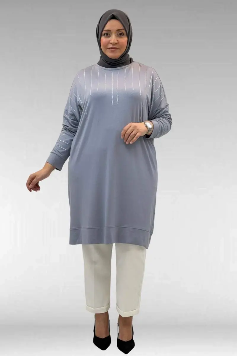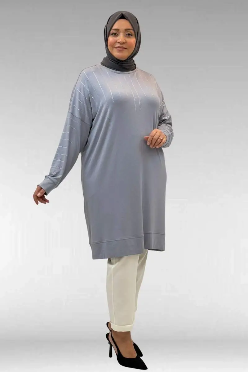 68020 Büyük Beden Damla Taş Detaylı Penye Tunik - Gri