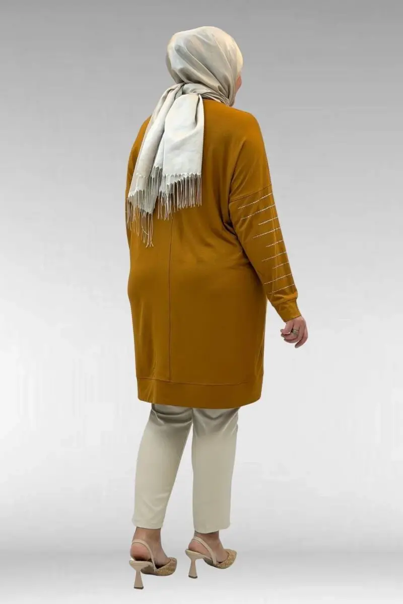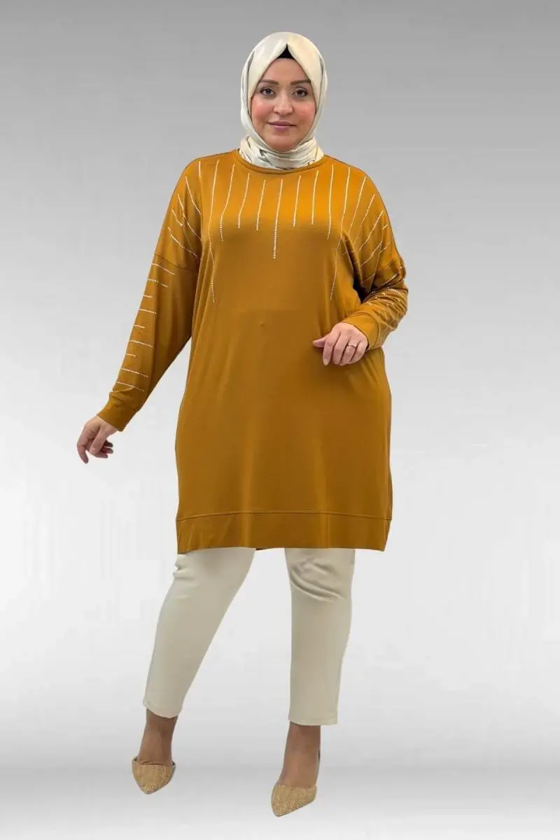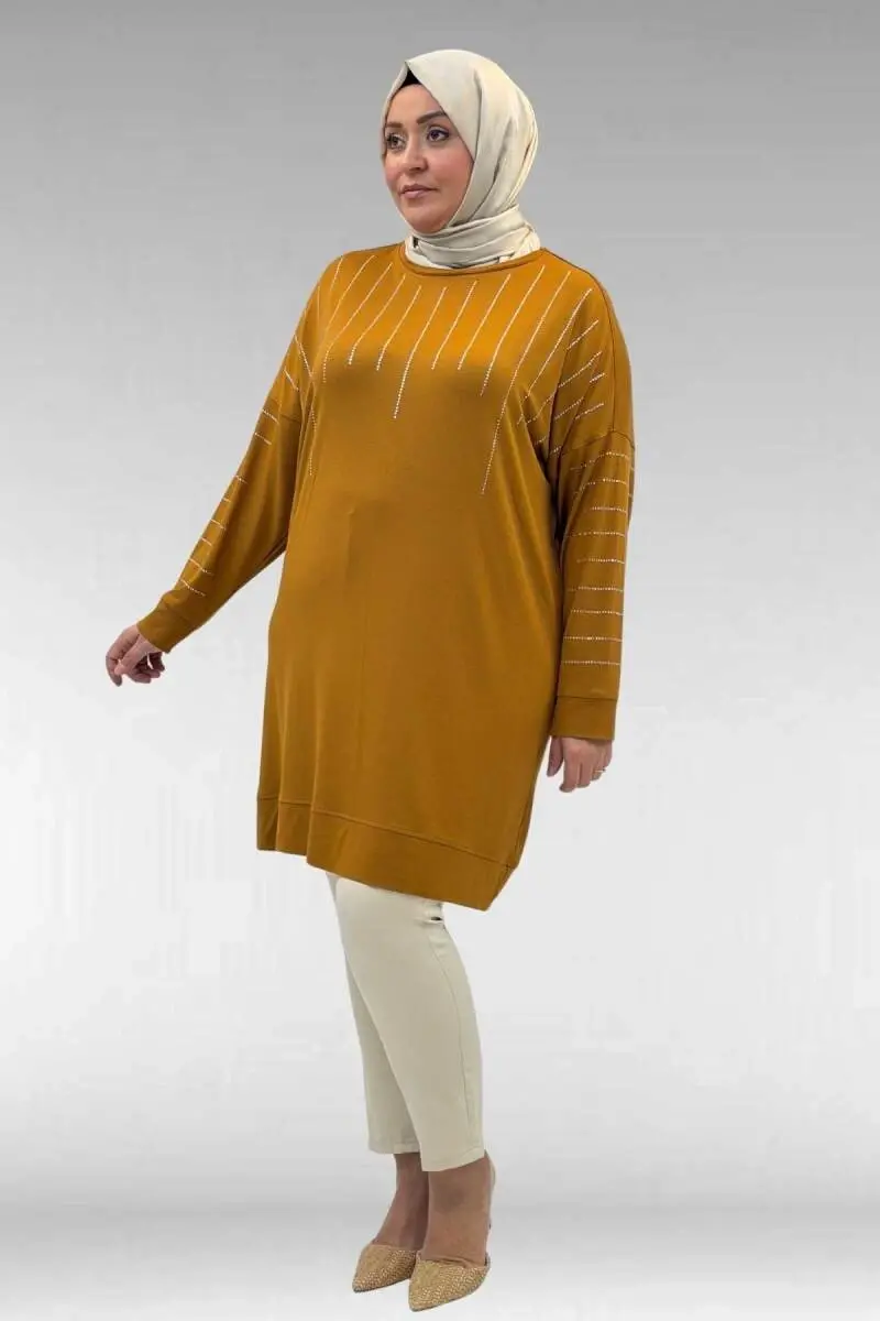 68020 Büyük Beden Damla Taş Detaylı Penye Tunik - Hardal