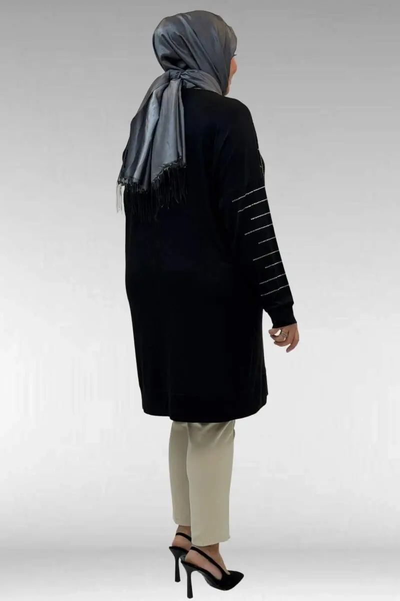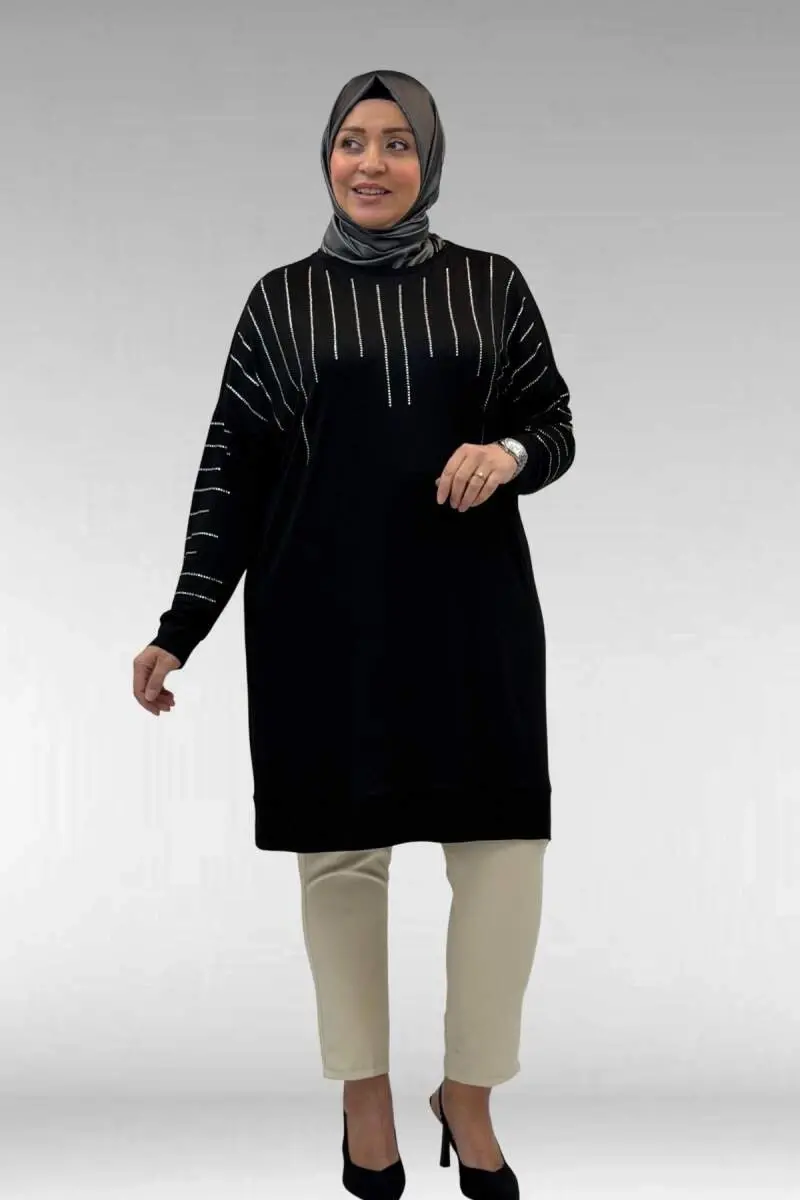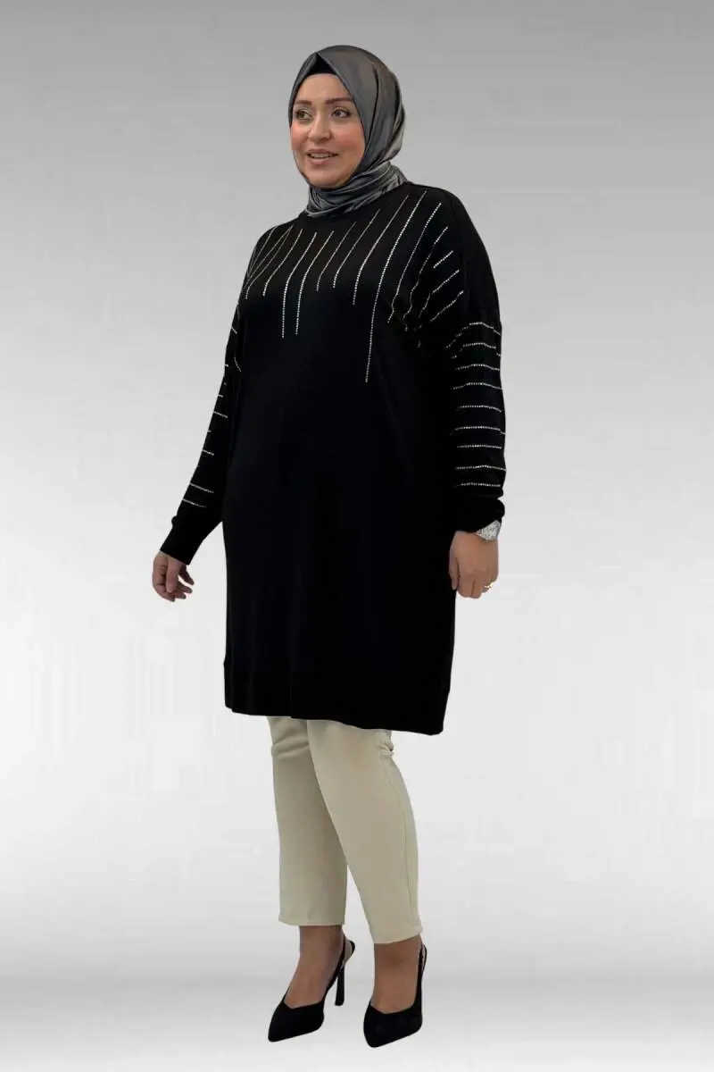 68020 Büyük Beden Damla Taş Detaylı Penye Tunik - Siyah