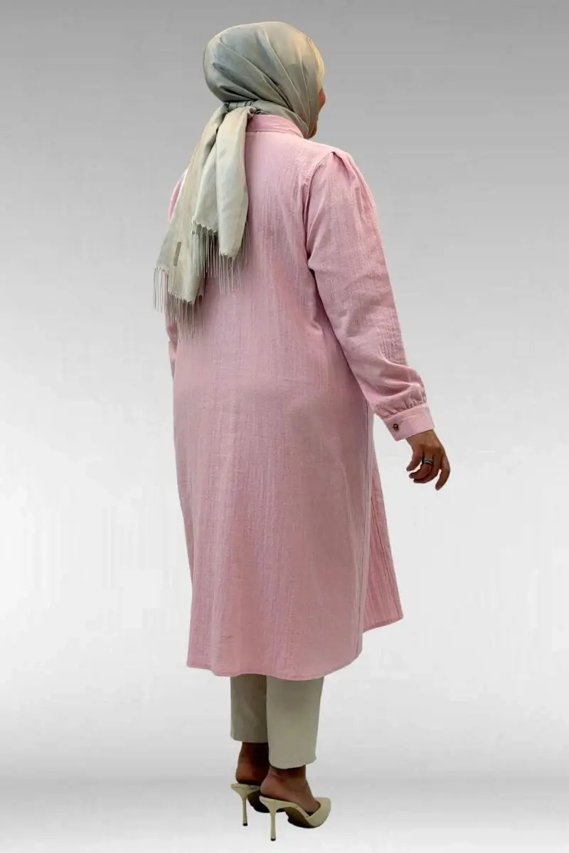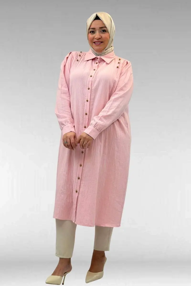 68021 Büyük Beden Düğme Detaylı Müslin Gömlek - Şeker Pembesi