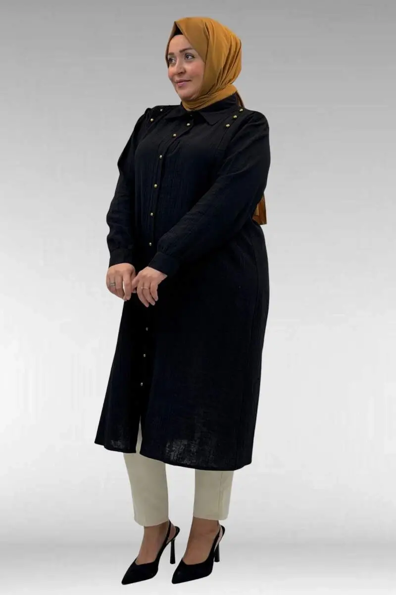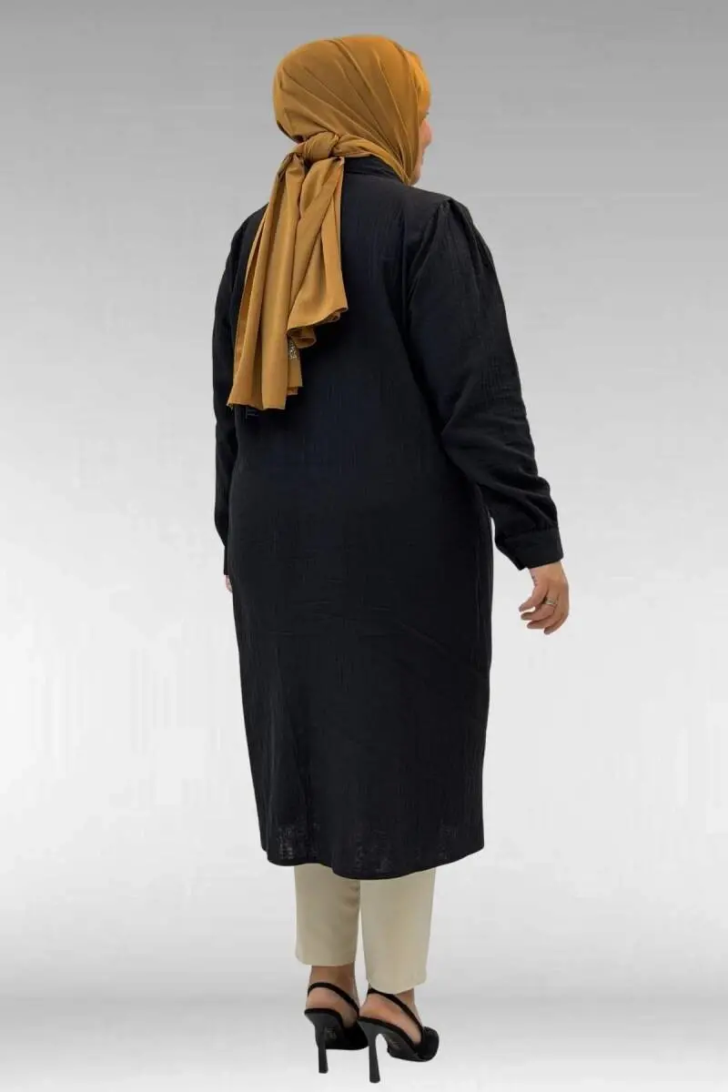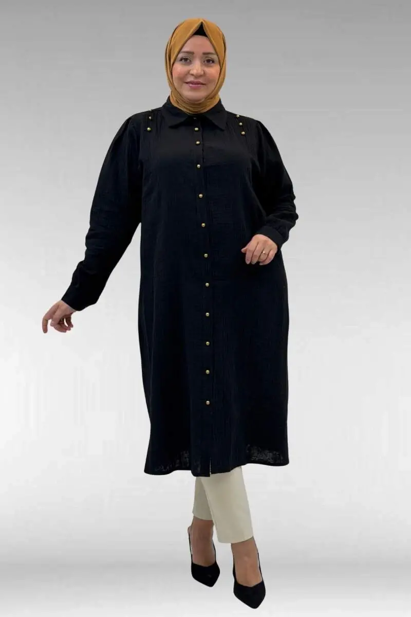 68021 Büyük Beden Düğme Detaylı Müslin Gömlek - Siyah