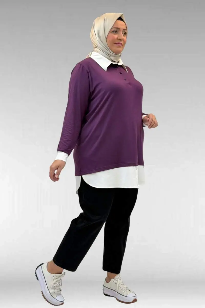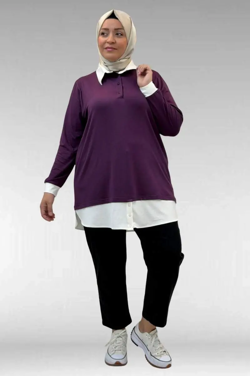 68028 Büyük Beden Kombinli -Manşetli Penye Tunik - Mürdüm