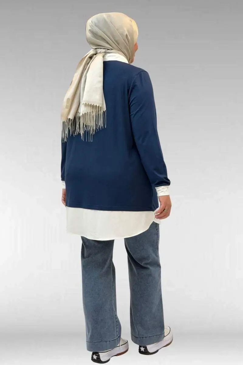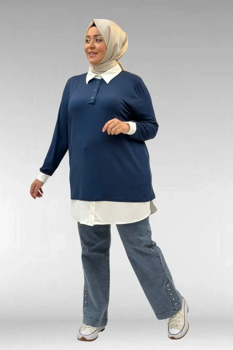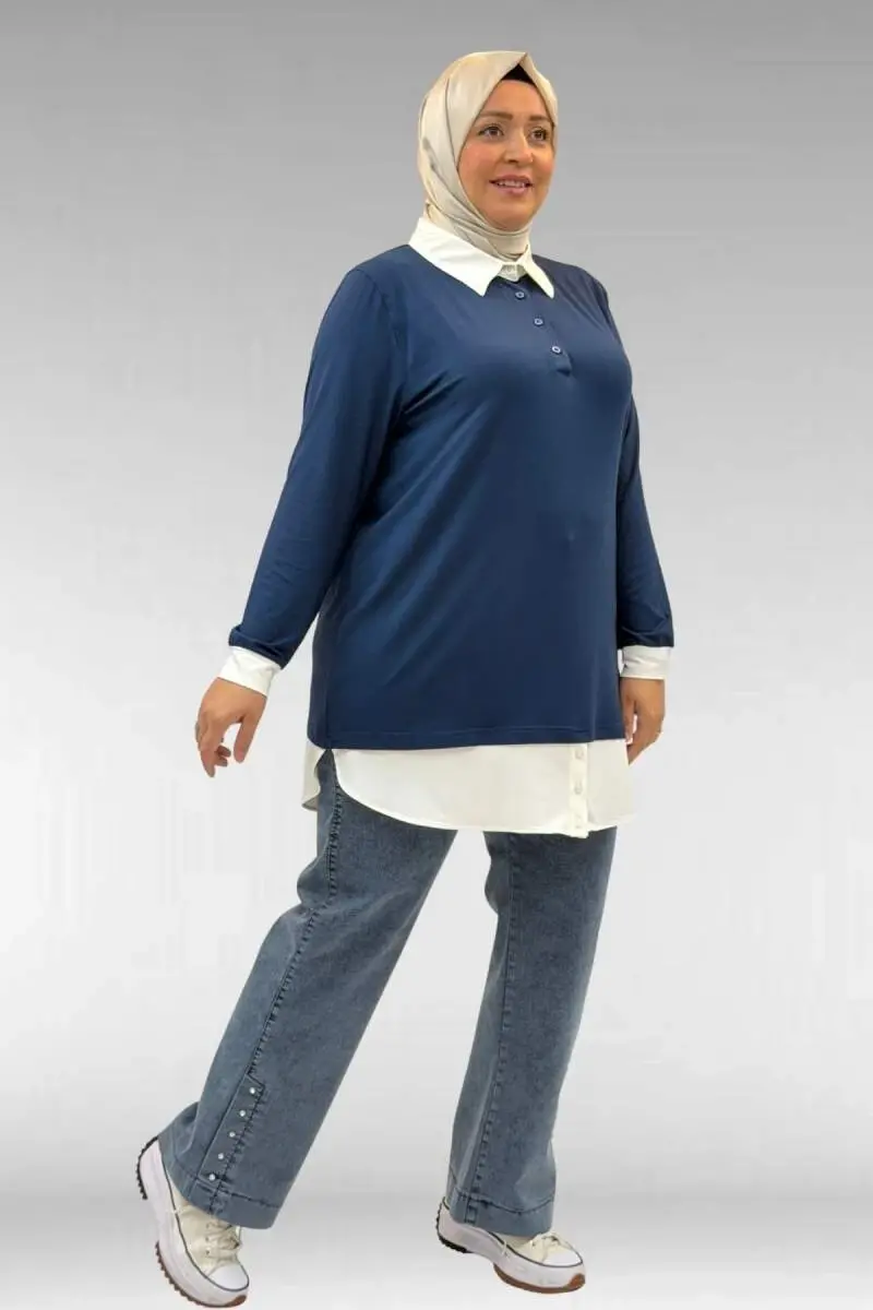 68028 Büyük Beden Kombinli -Manşetli Penye Tunik - Petrol