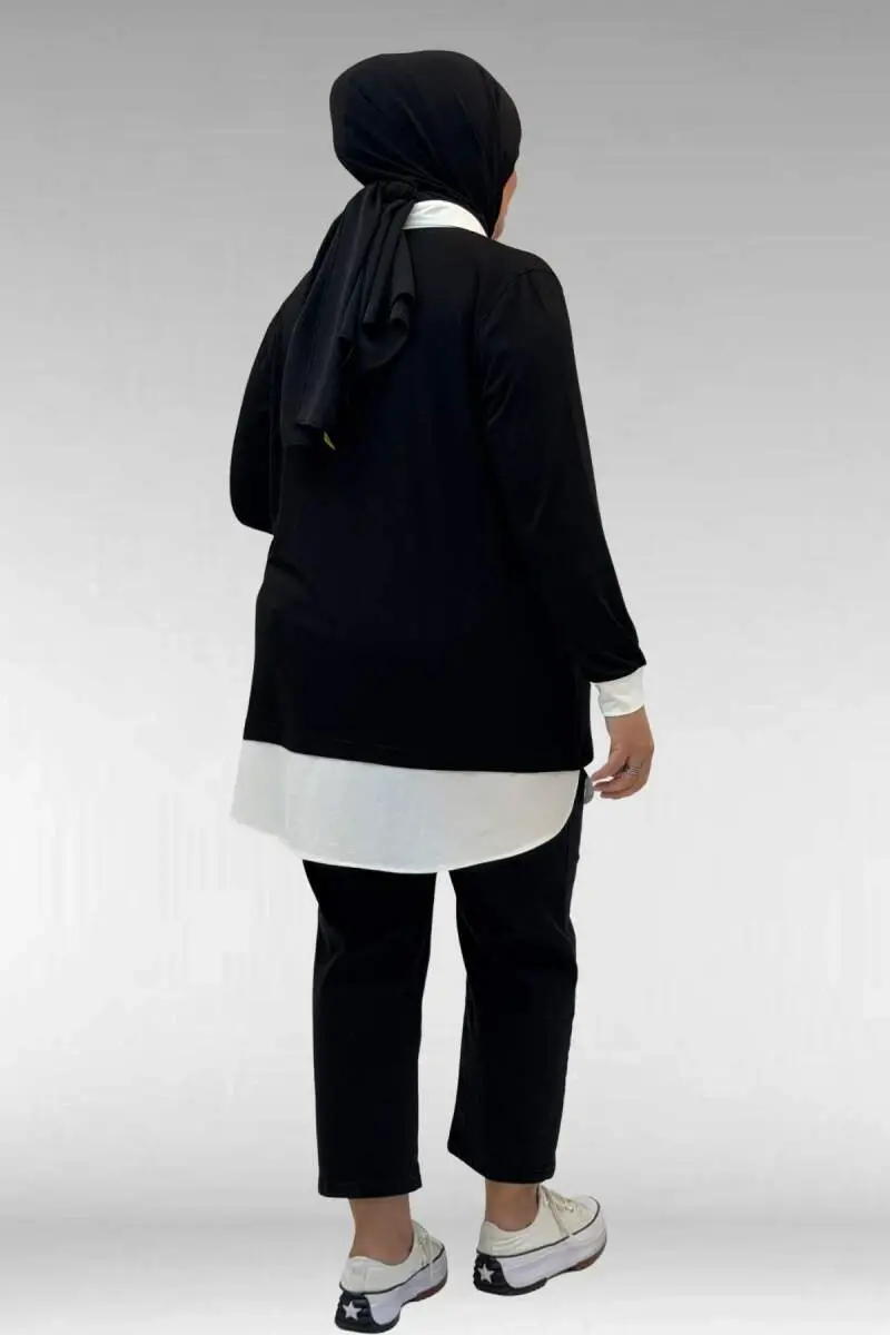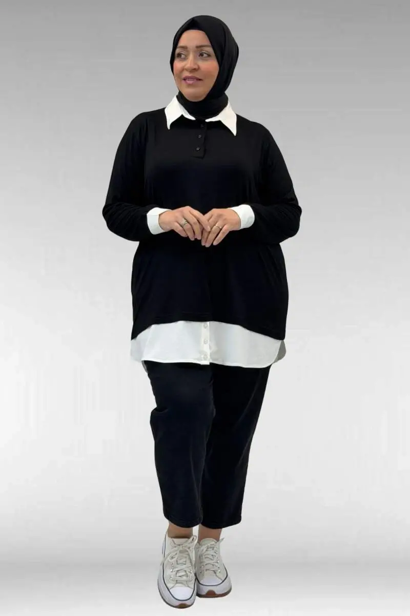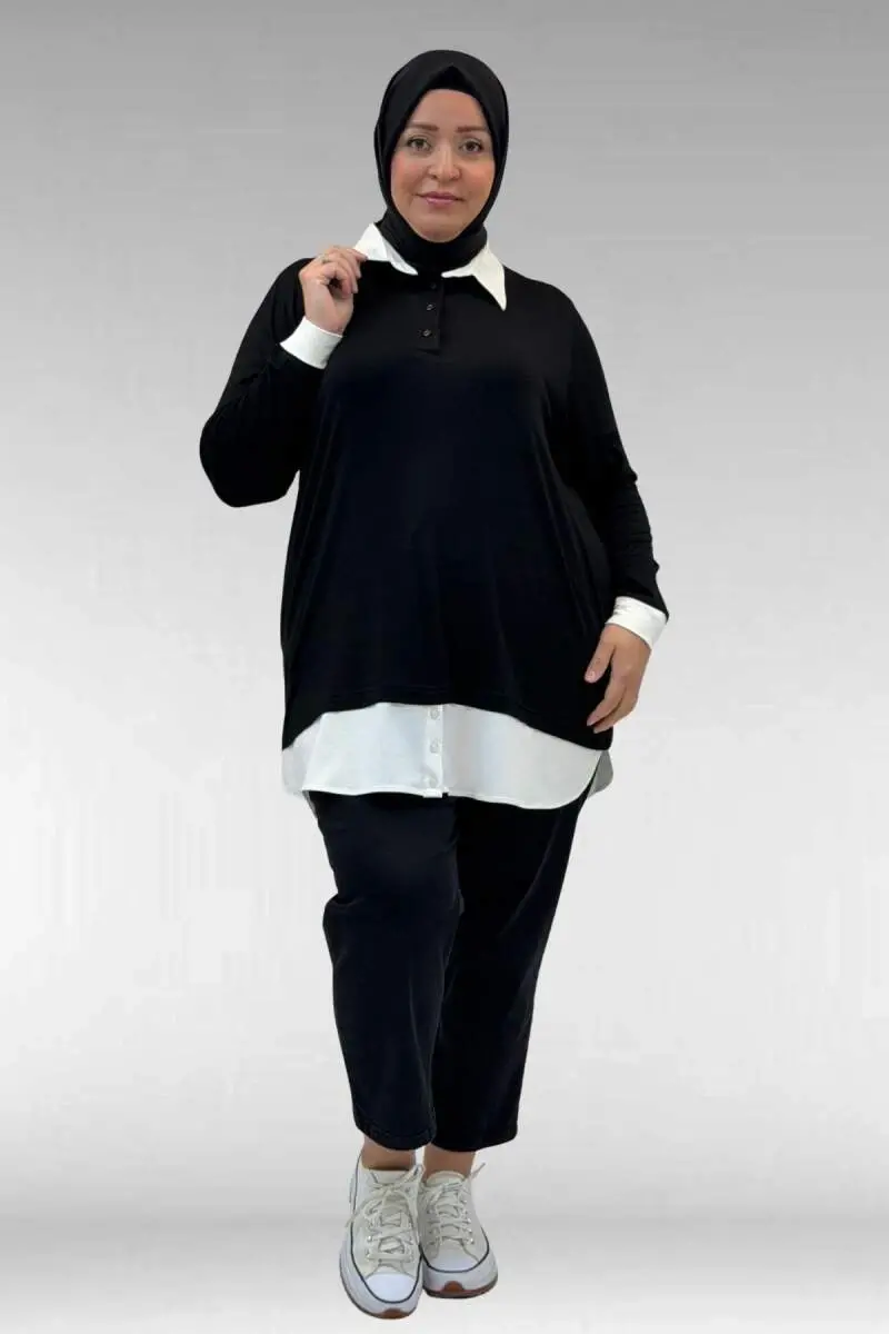 68028 Büyük Beden Kombinli -Manşetli Penye Tunik - Siyah